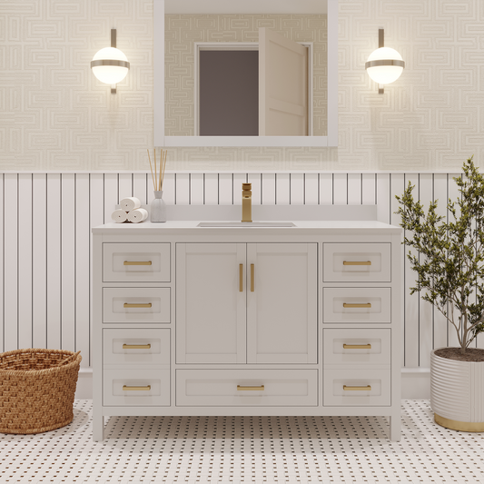 Rooh 48 Inch Solid Wood Bathroom Vanity with Undermount single Rectangle sink & White Quartz countertop 0.75 inch edge in white