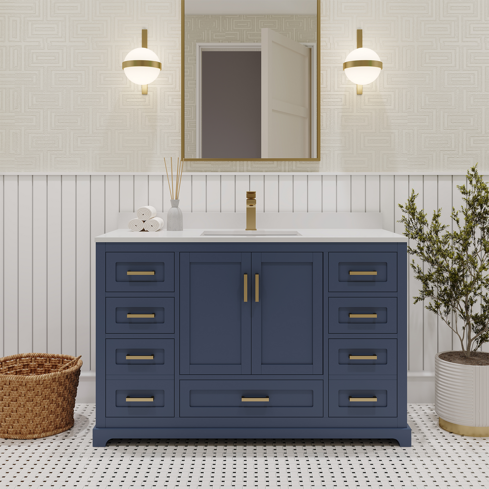 Material & Build:This 48” W x 22” D x 32.75”H-wooden bathroom vanity is made of a solid natural wood material frame for strength and long-lasting durability. The HDHMR wood panels are a premium engineered wood that offers superior durability and moisture resistance, making it suitable for long term use in humid conditions. This 48-inch bathroom vanity is hand finished with an 8 stage Sherwin Williams painting process, which guarantees excellent durability, moisture resistance, and long-wear protection. Unlike MDF or particleboard vanities, our products are produced with 100% recyclable eco certified materials. This not only makes it a greener choice, but also a lifelong investment that will beautify your space for years to come.