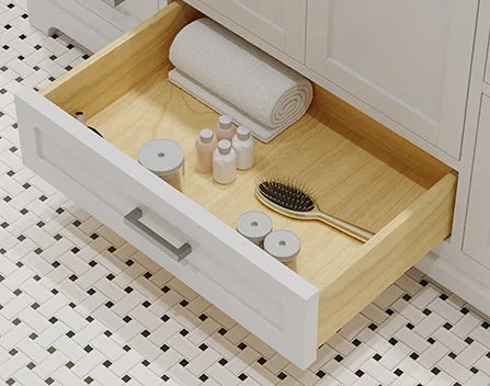 The natural wood bathroom vanity drawer combines functionality and style, offering ample storage for toiletries and towels. Its warm finish adds tranquility and sophistication, while smooth operation enhances convenience and enjoyment.