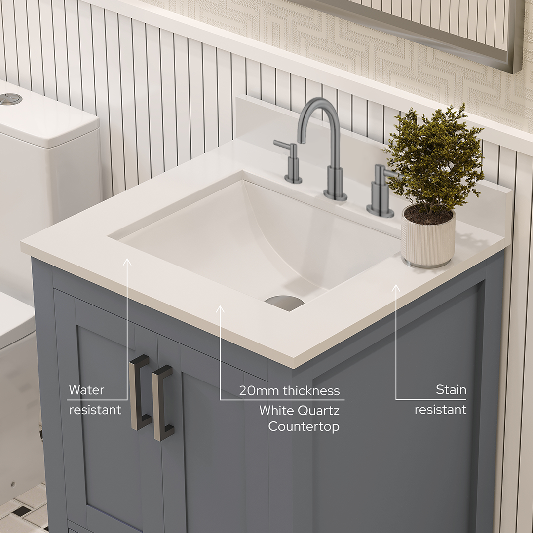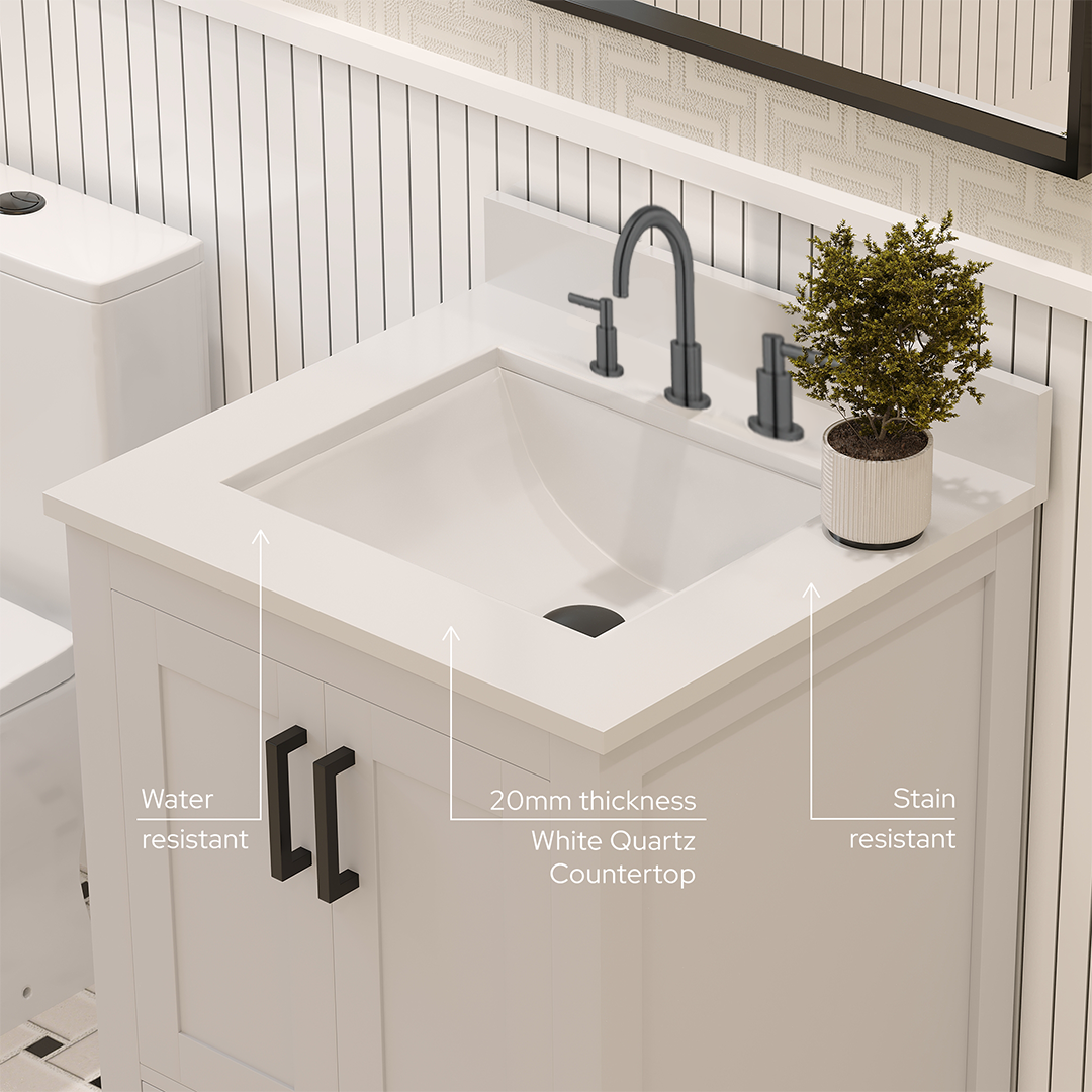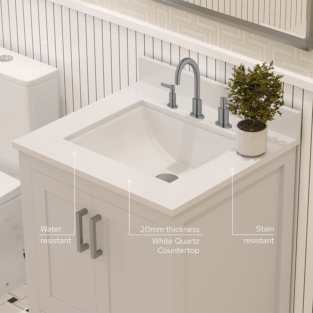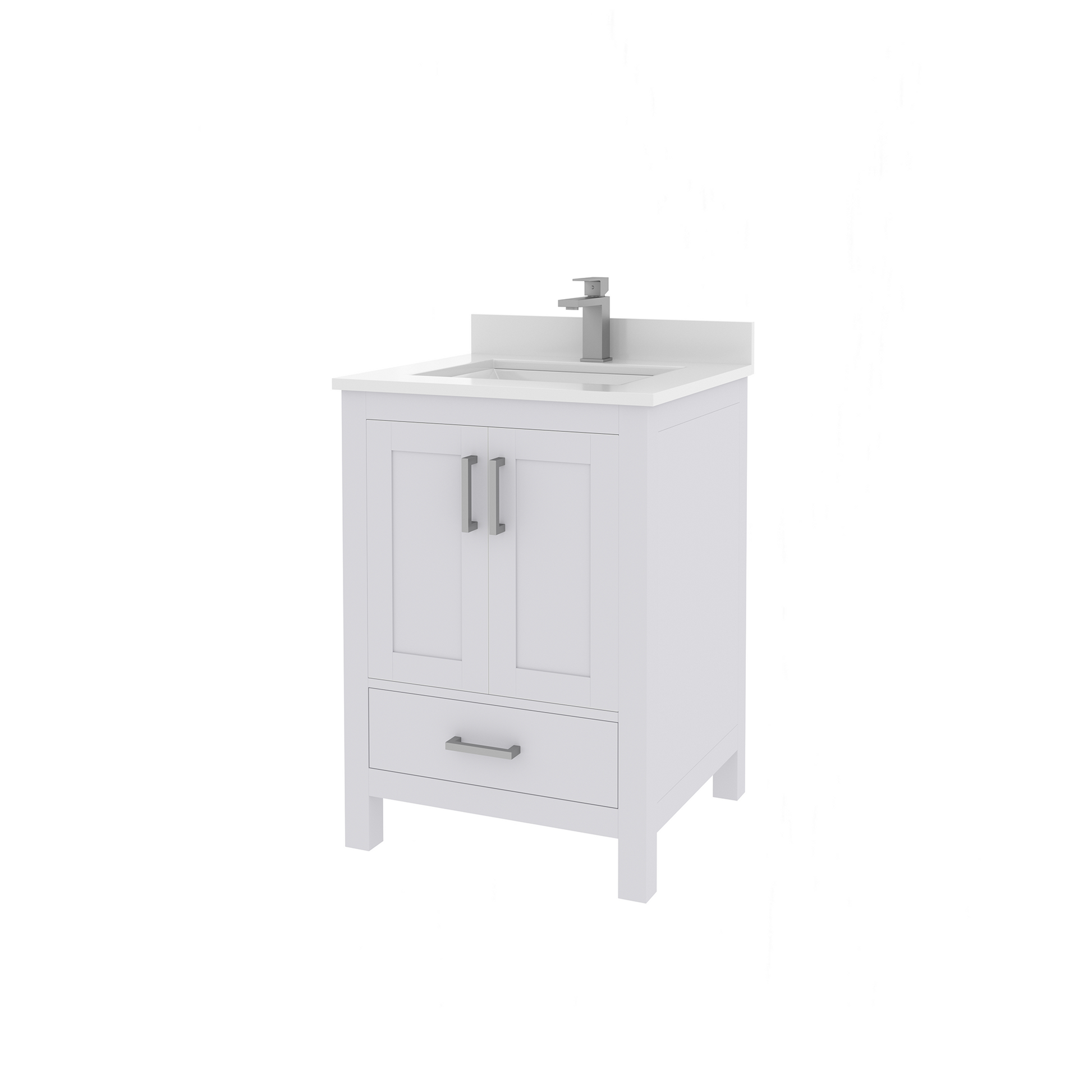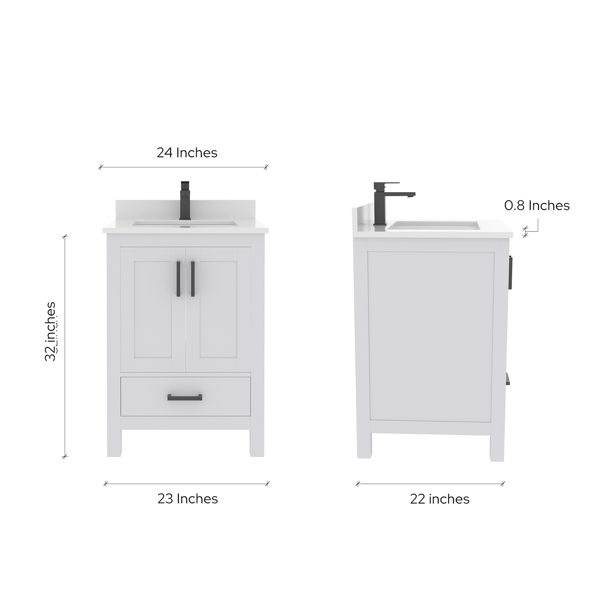 Rooh 24 Inch Solid Wood Bathroom Vanity with Undermount single Rectangle sink & White Quartz countertop 0.75 inch edge in white