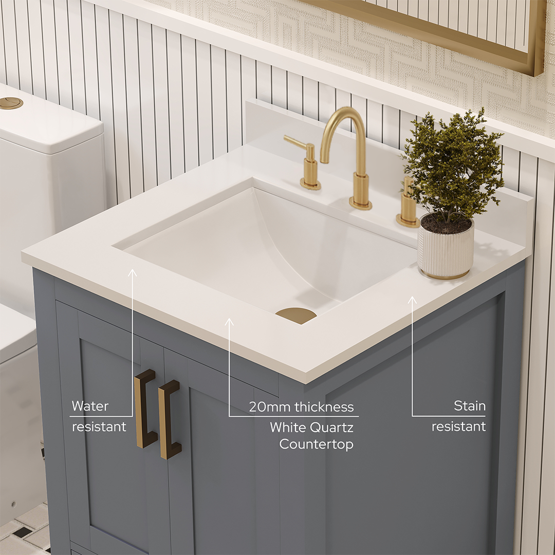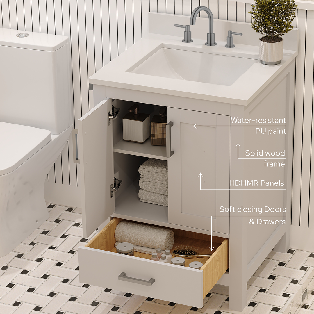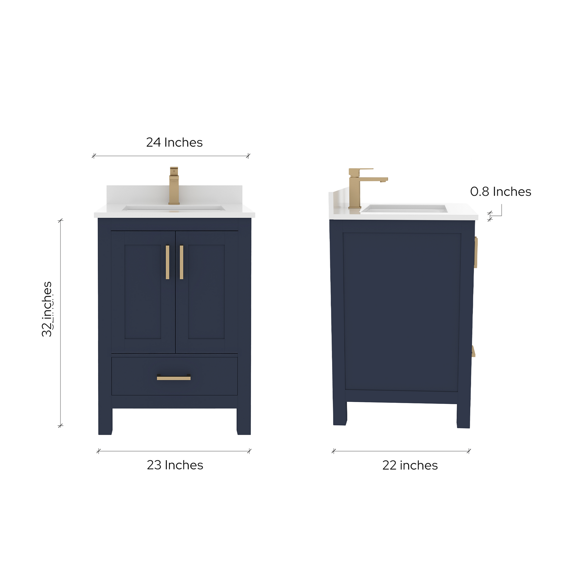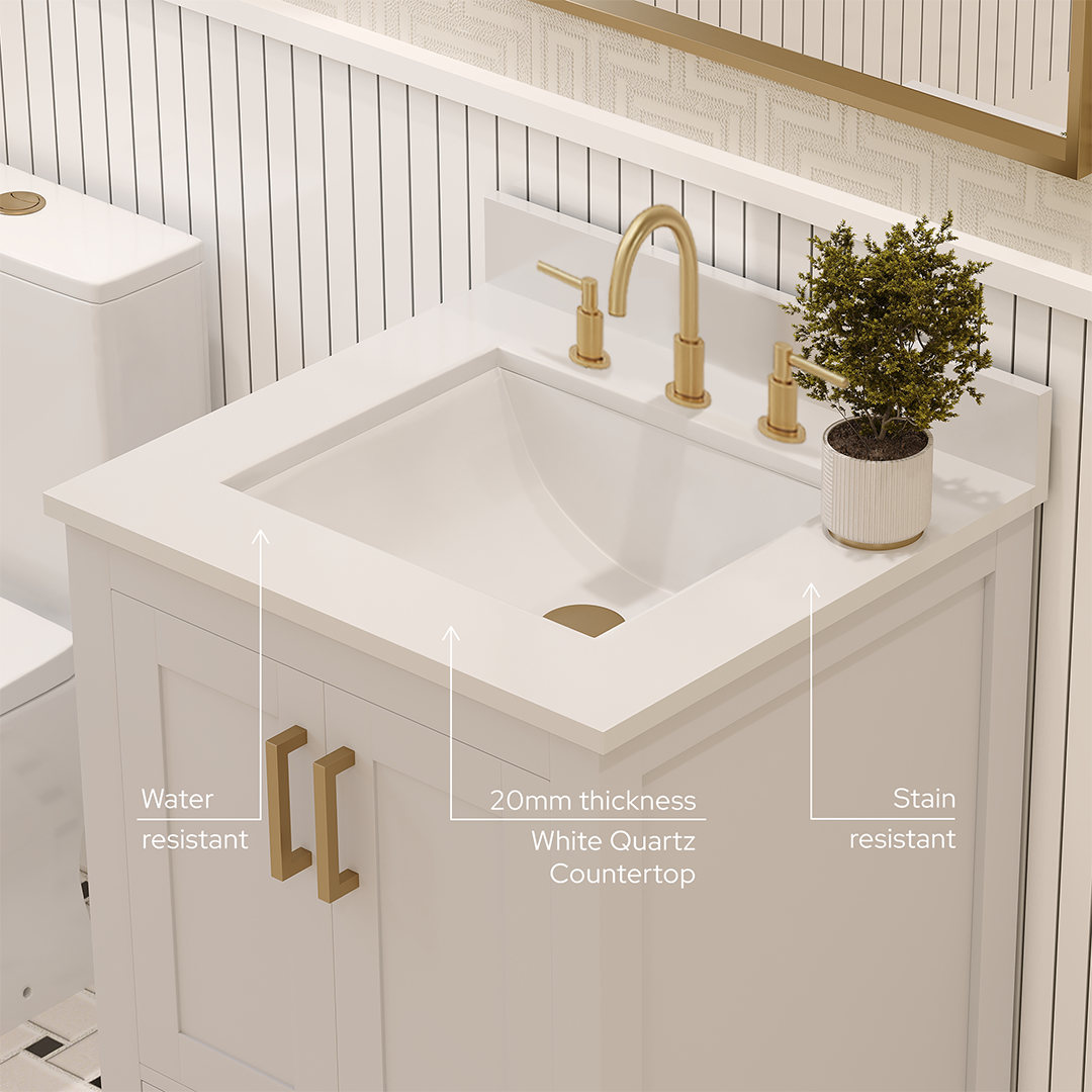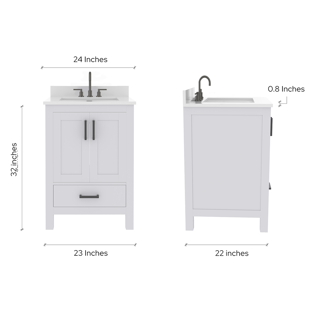 Rooh 24 Inch Solid Wood Bathroom Vanity with Undermount single Rectangle sink & White Quartz countertop 0.75 inch edge in white