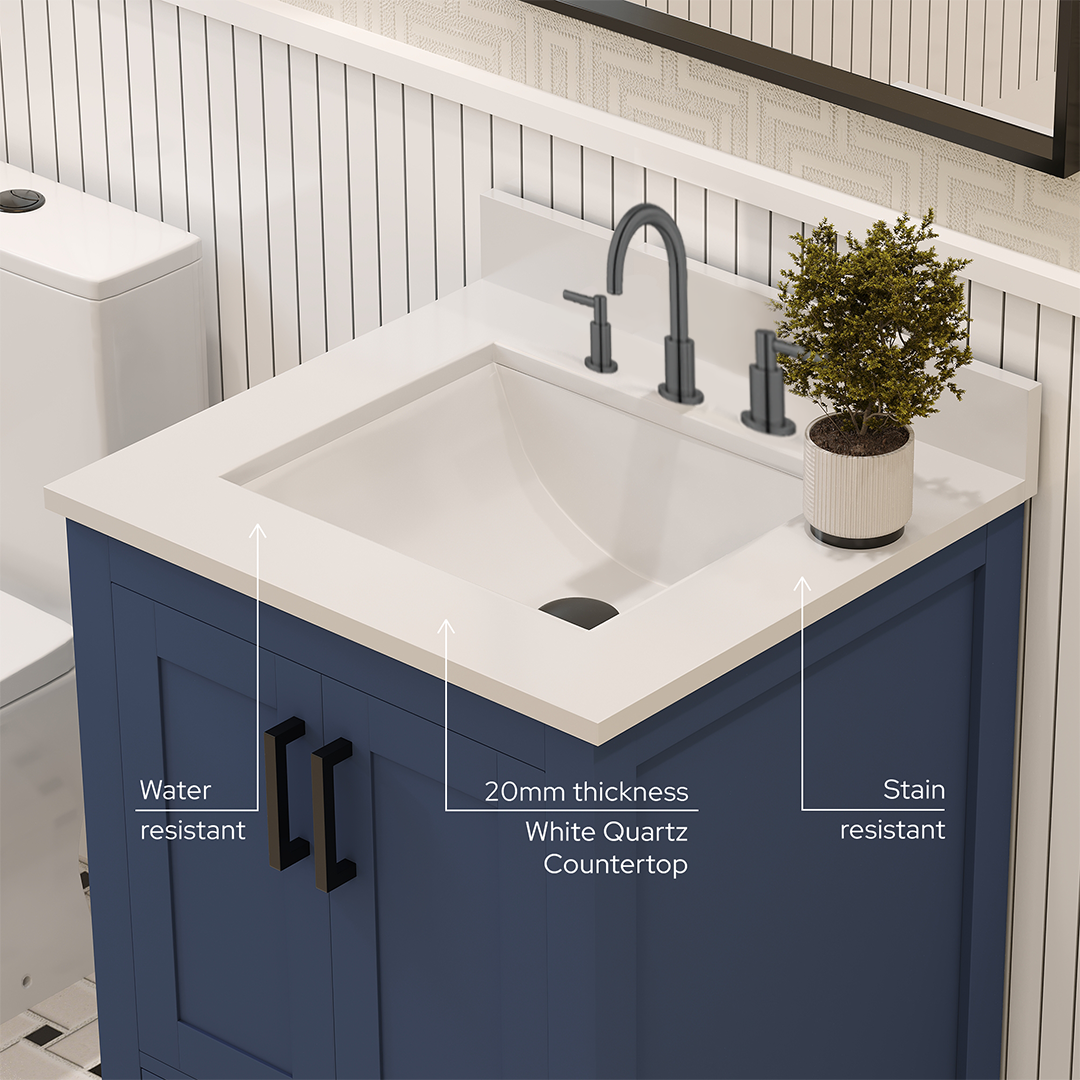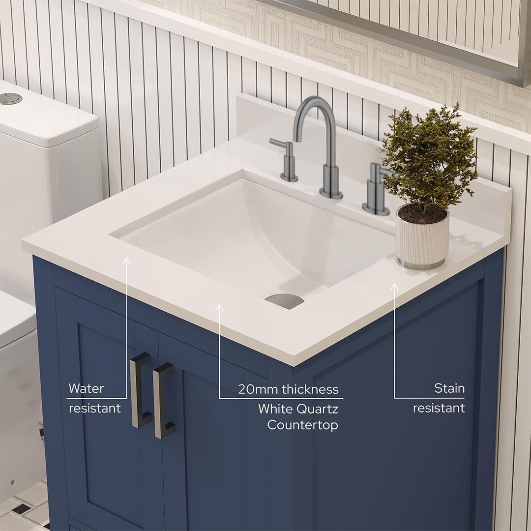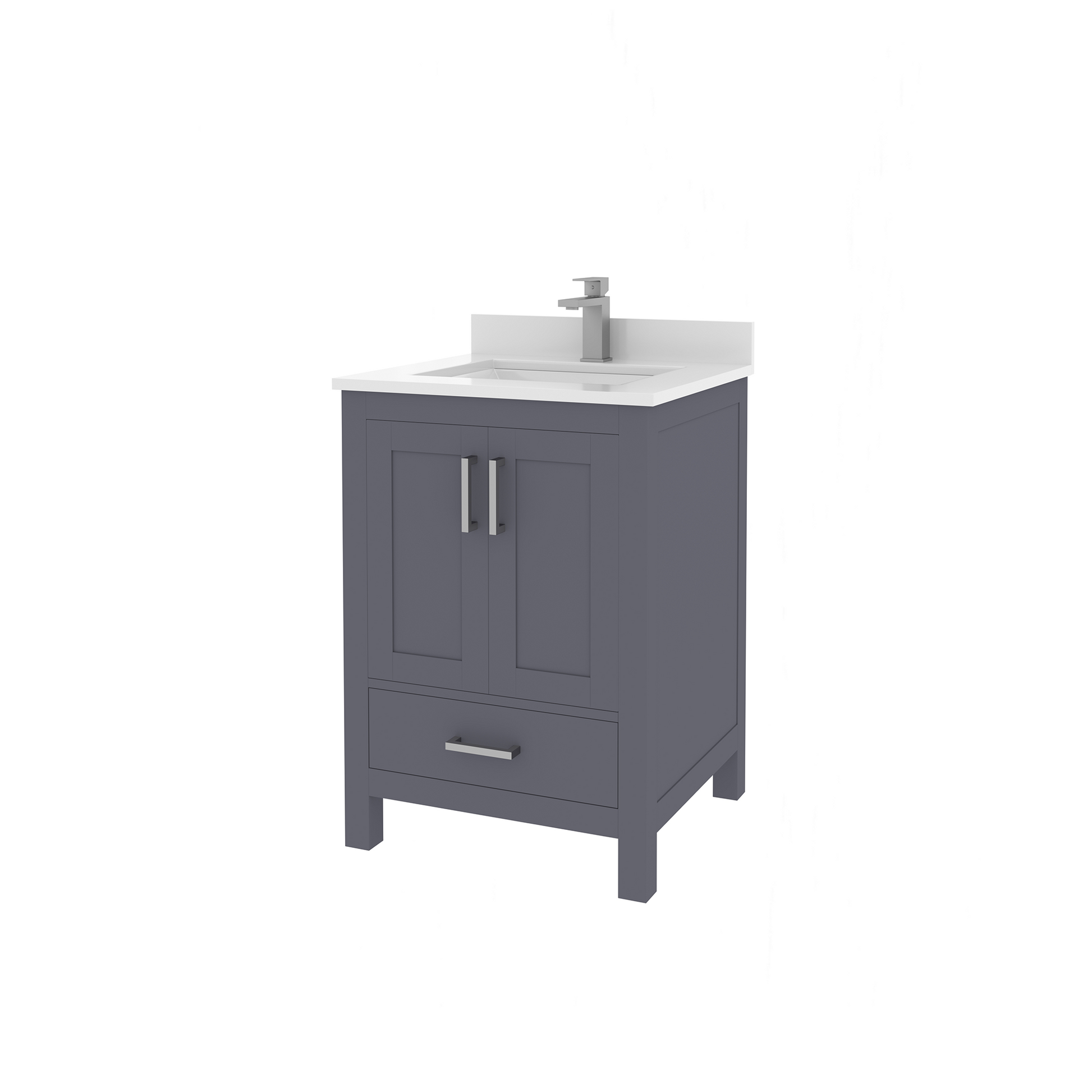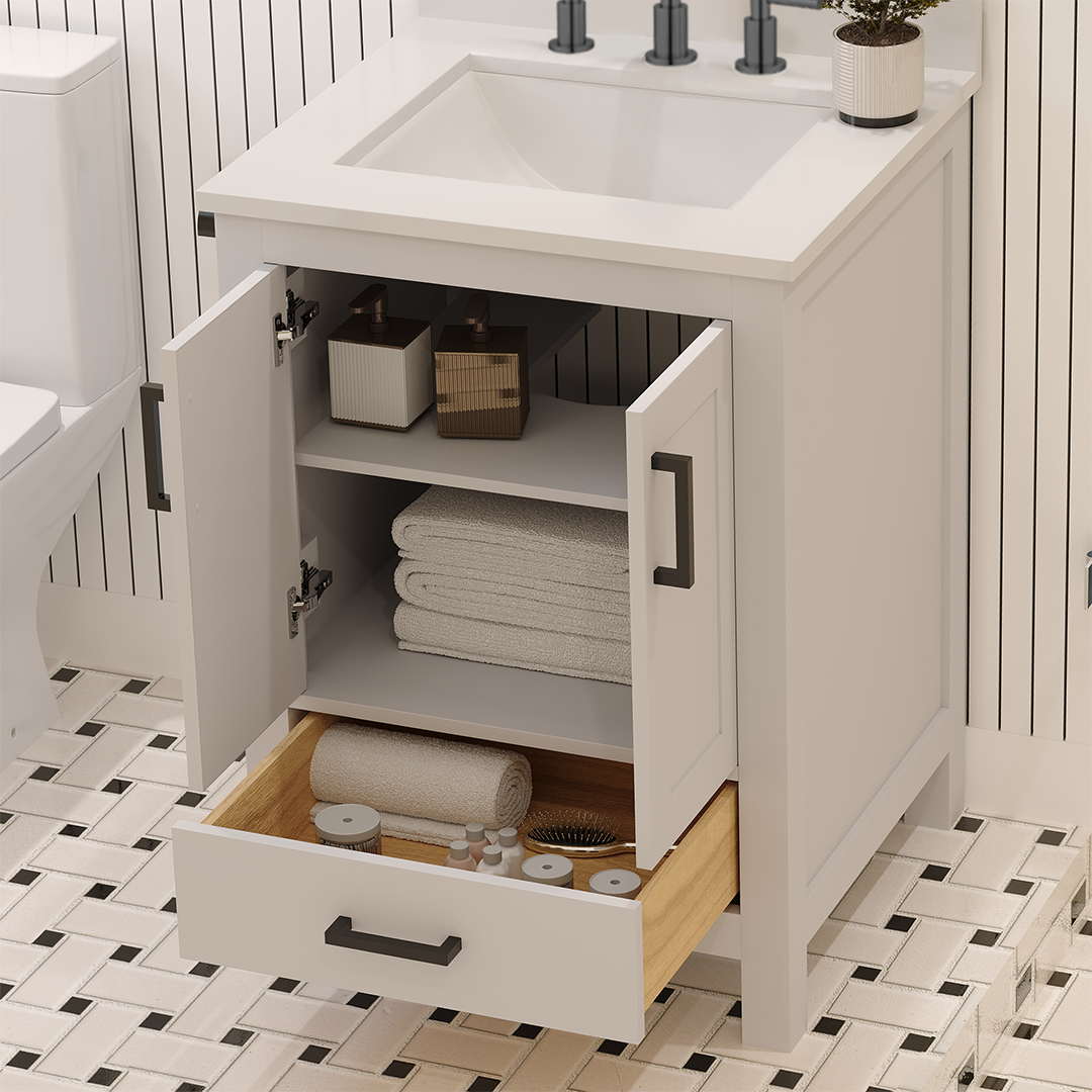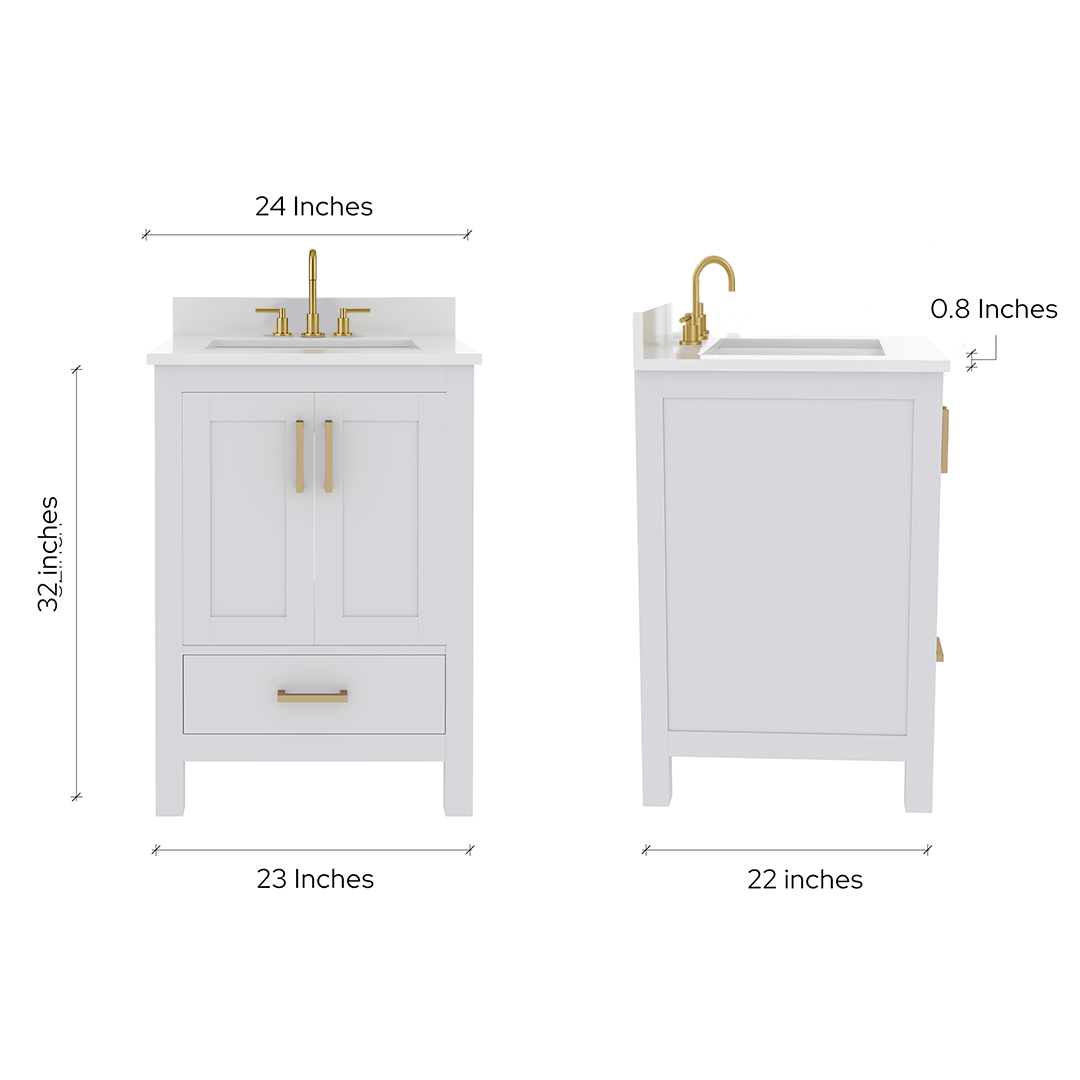 Rooh 24 Inch Solid Wood Bathroom Vanity with Undermount single Rectangle sink & White Quartz countertop 0.75 inch edge in white