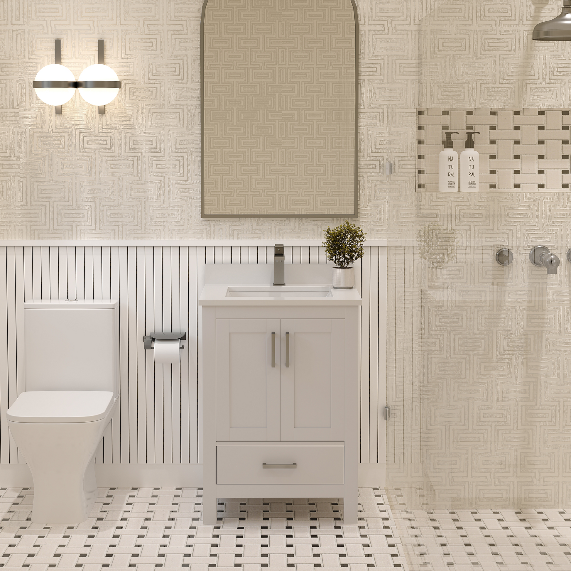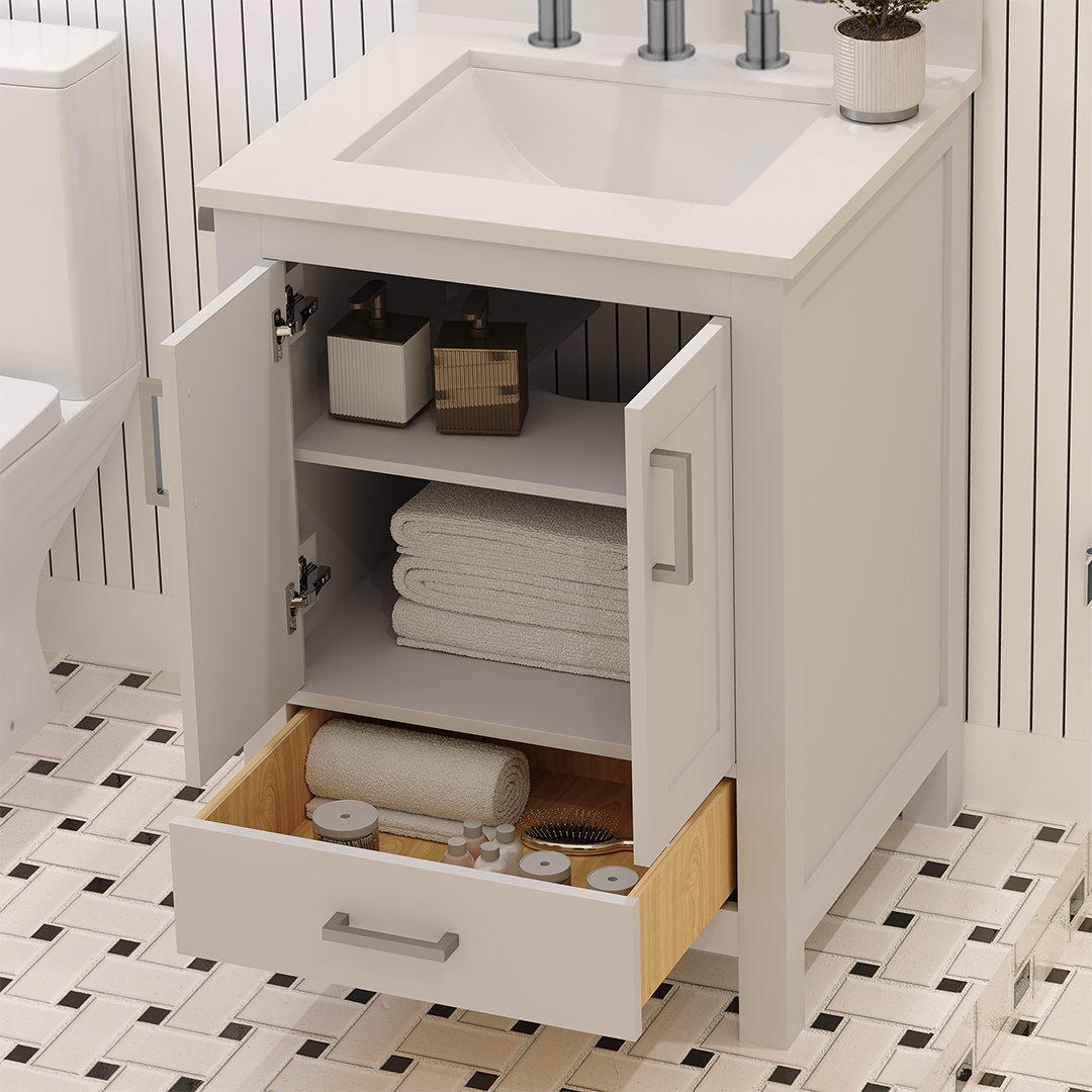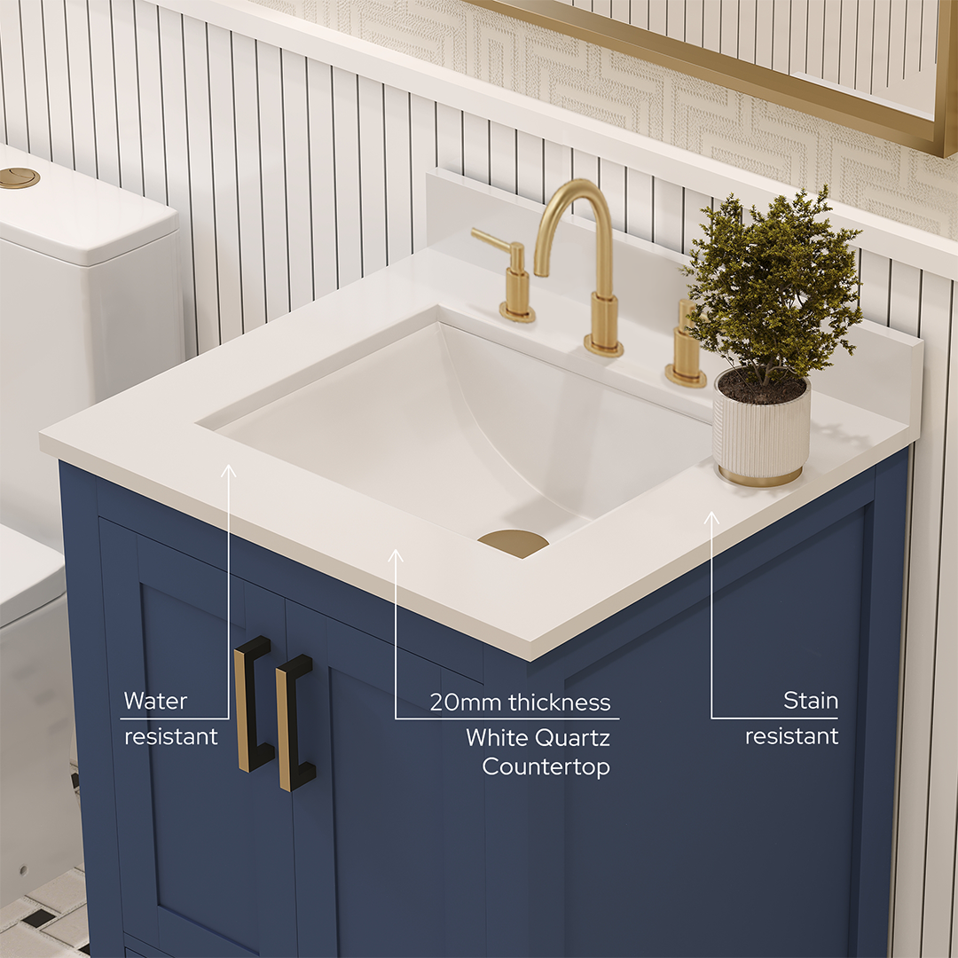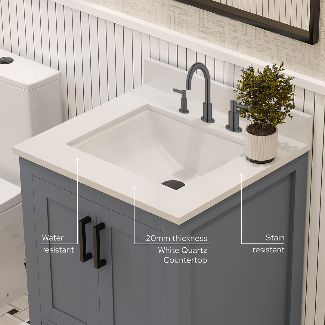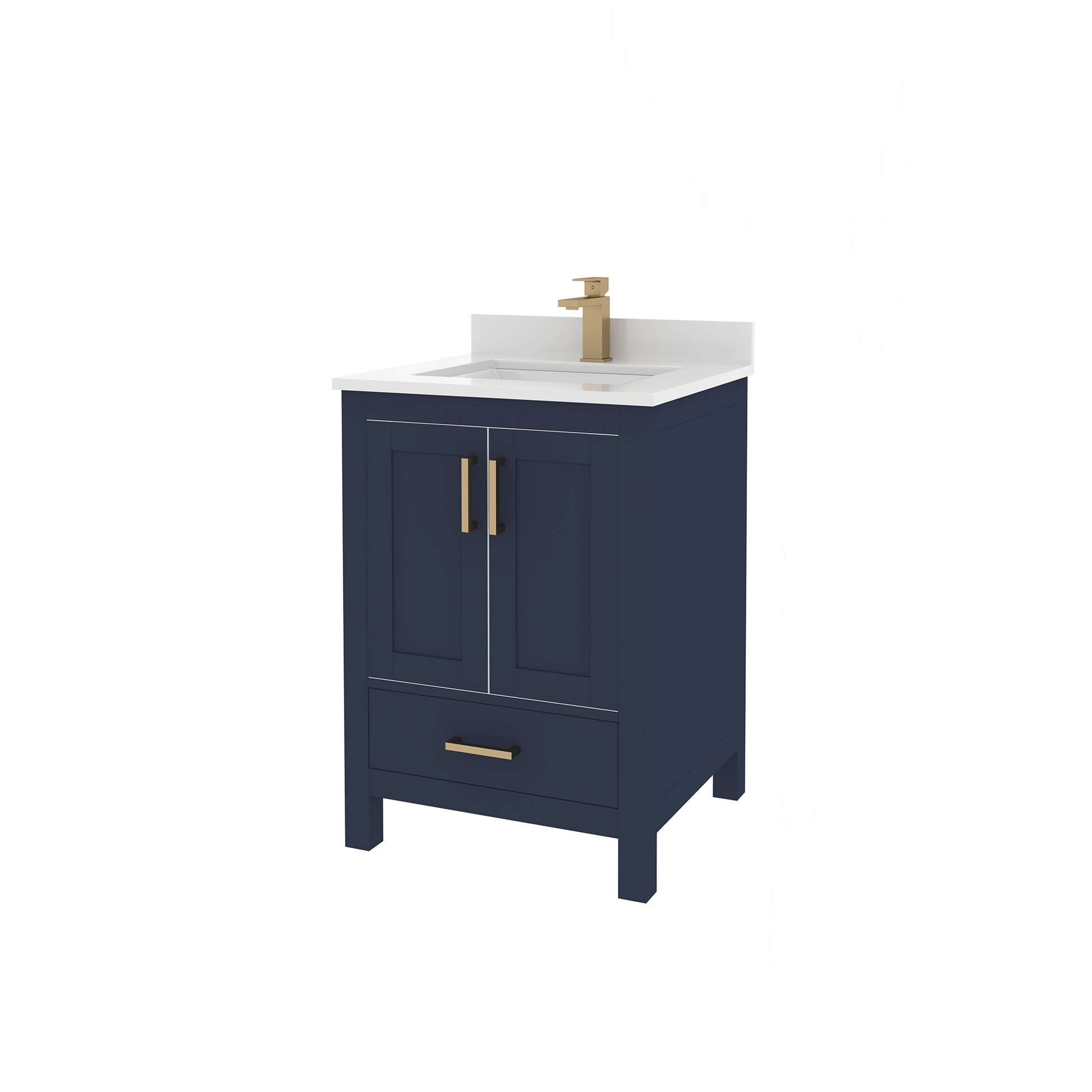 Rooh 24 Inch Solid Wood Bathroom Vanity with Undermount single Rectangle sink & White Quartz countertop 0.75 inch edge in white