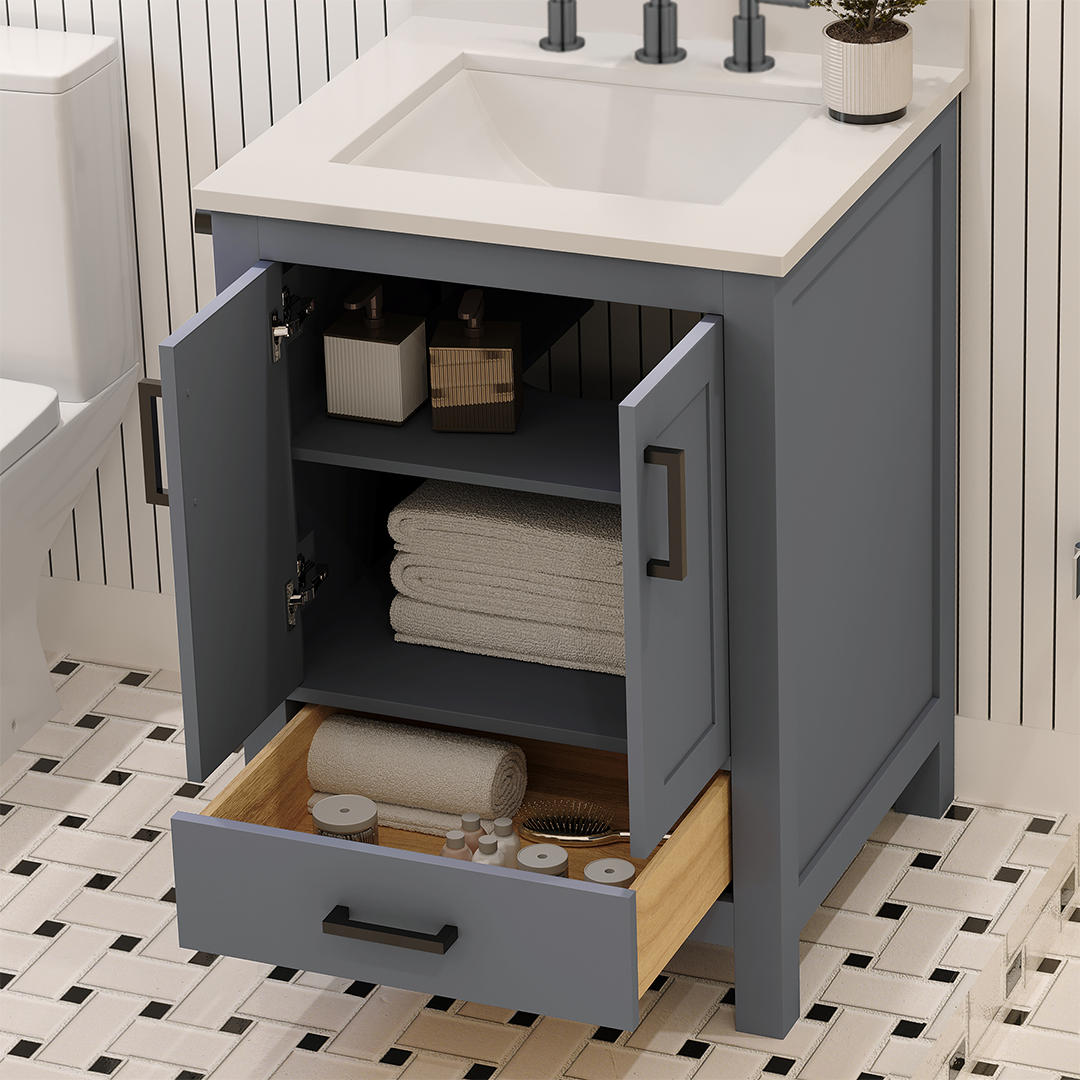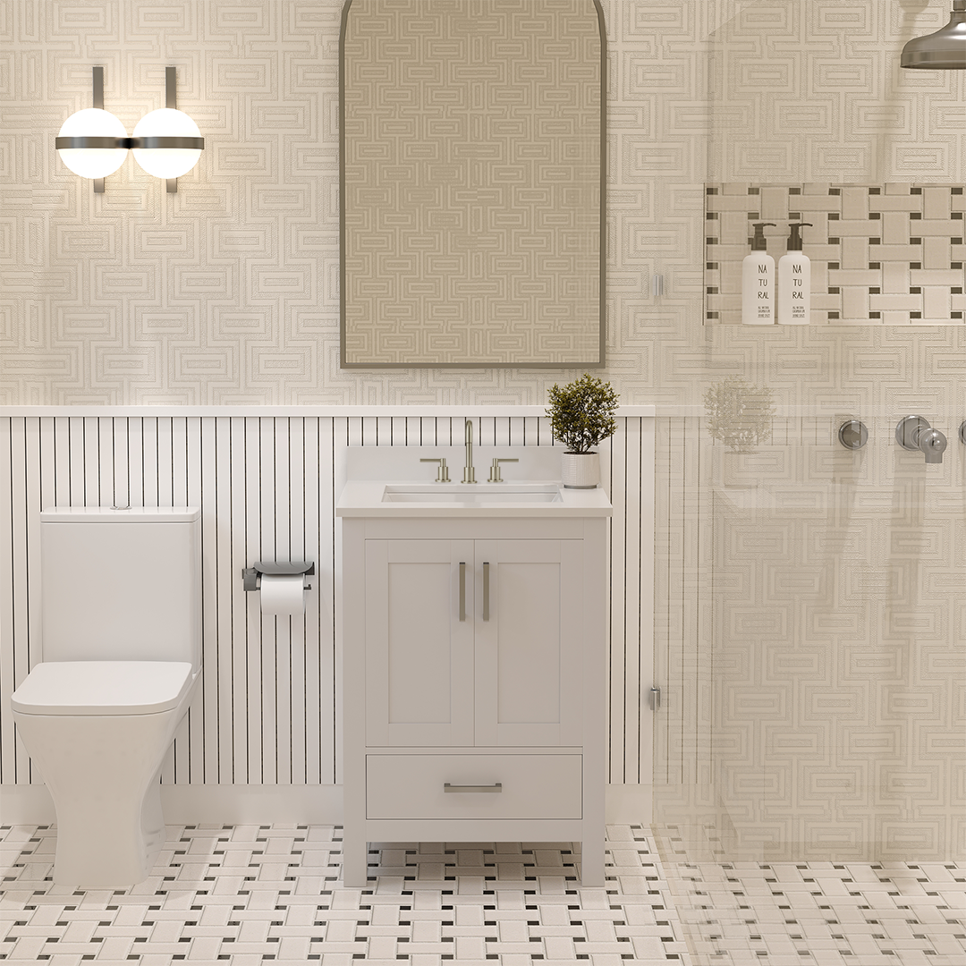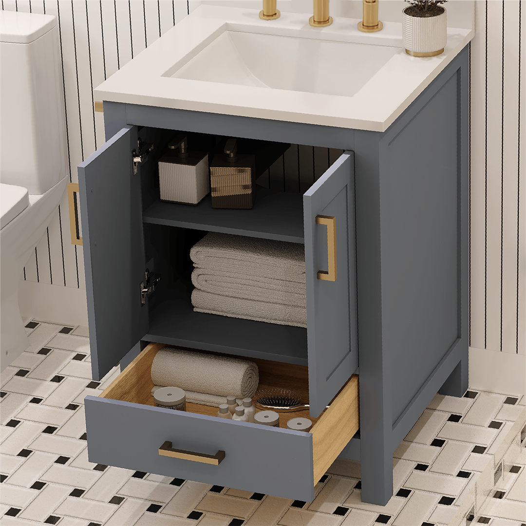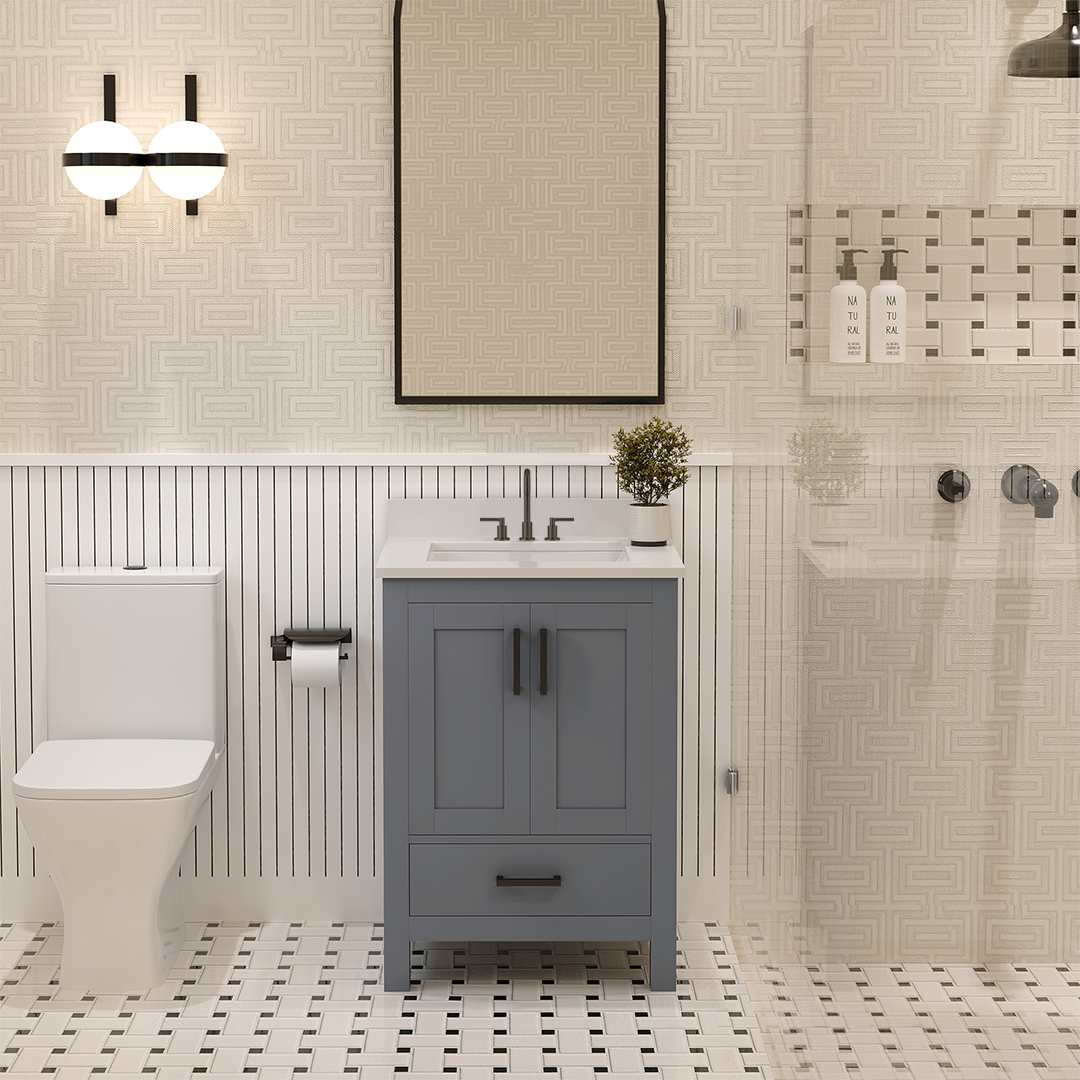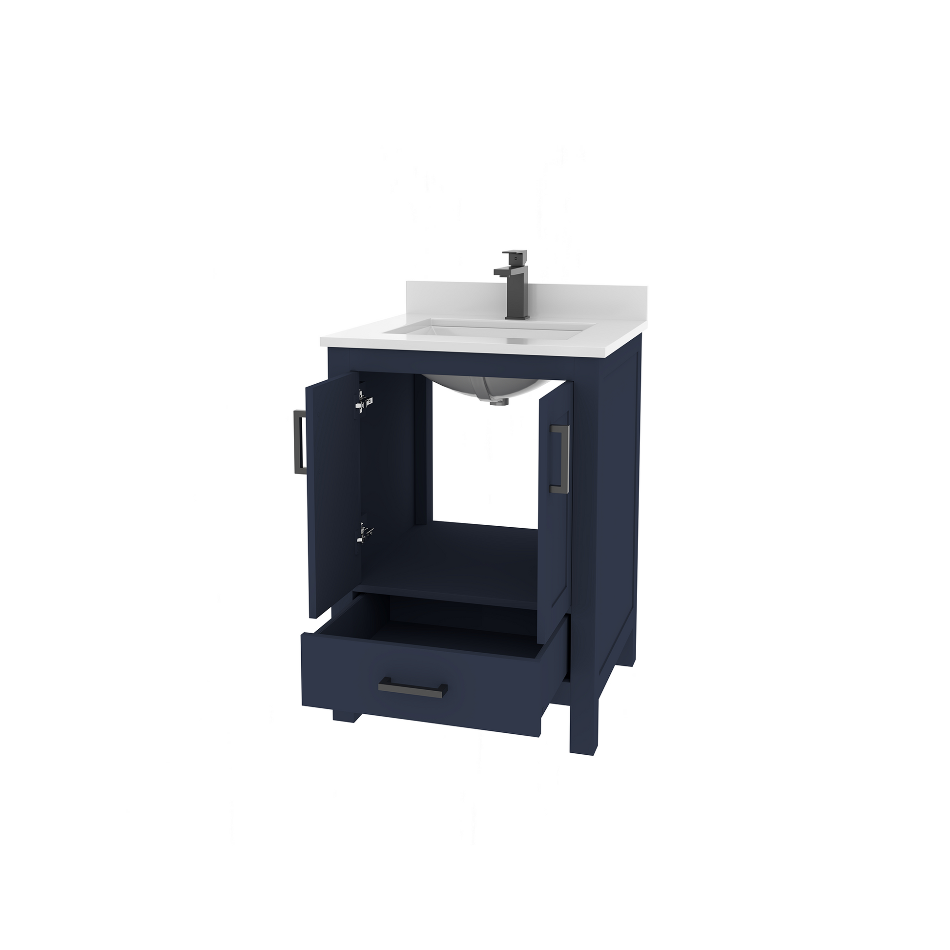 Rooh 24 Inch Solid Wood Bathroom Vanity with Undermount single Rectangle sink & White Quartz countertop 0.75 inch edge in white