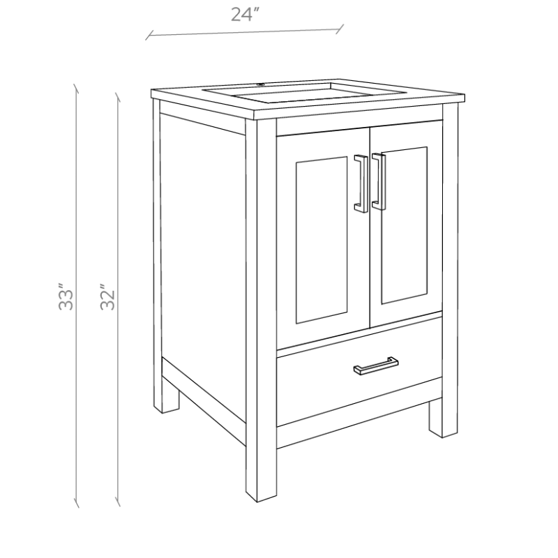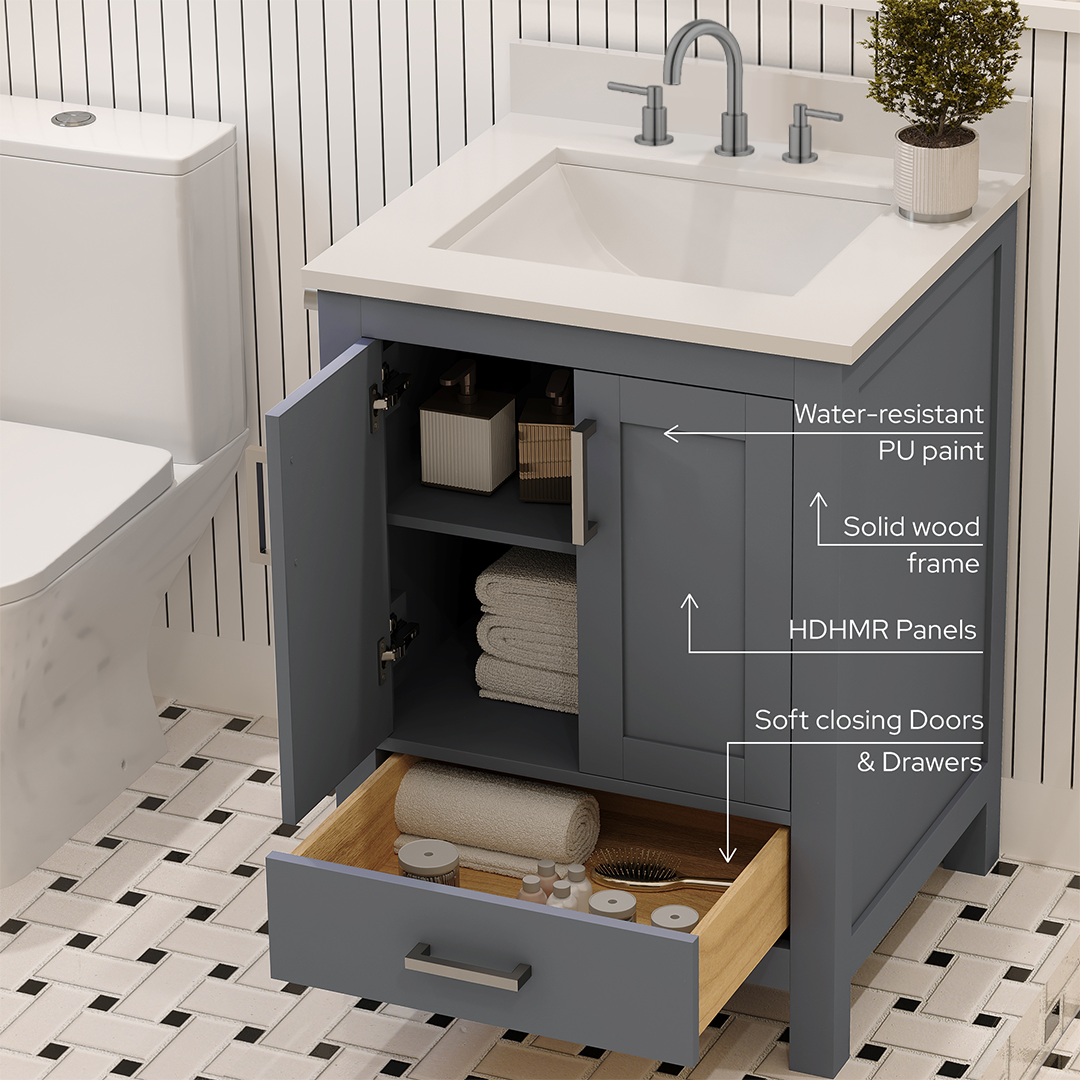 Material & Build: This 24” W x 22” D x 32.75” H wooden bathroom vanity is made of a solid natural wood material frame for strength and long-lasting durability. The HDHMR wood panels are a premium engineered wood that offers superior durability and moisture resistance, making it suitable for long term use in humid conditions. This 24-inch bathroom vanity is hand finished with a 8 stage Sherwin Williams painting process, which guarantees excellent durability, moisture resistance, and long-wear protection.