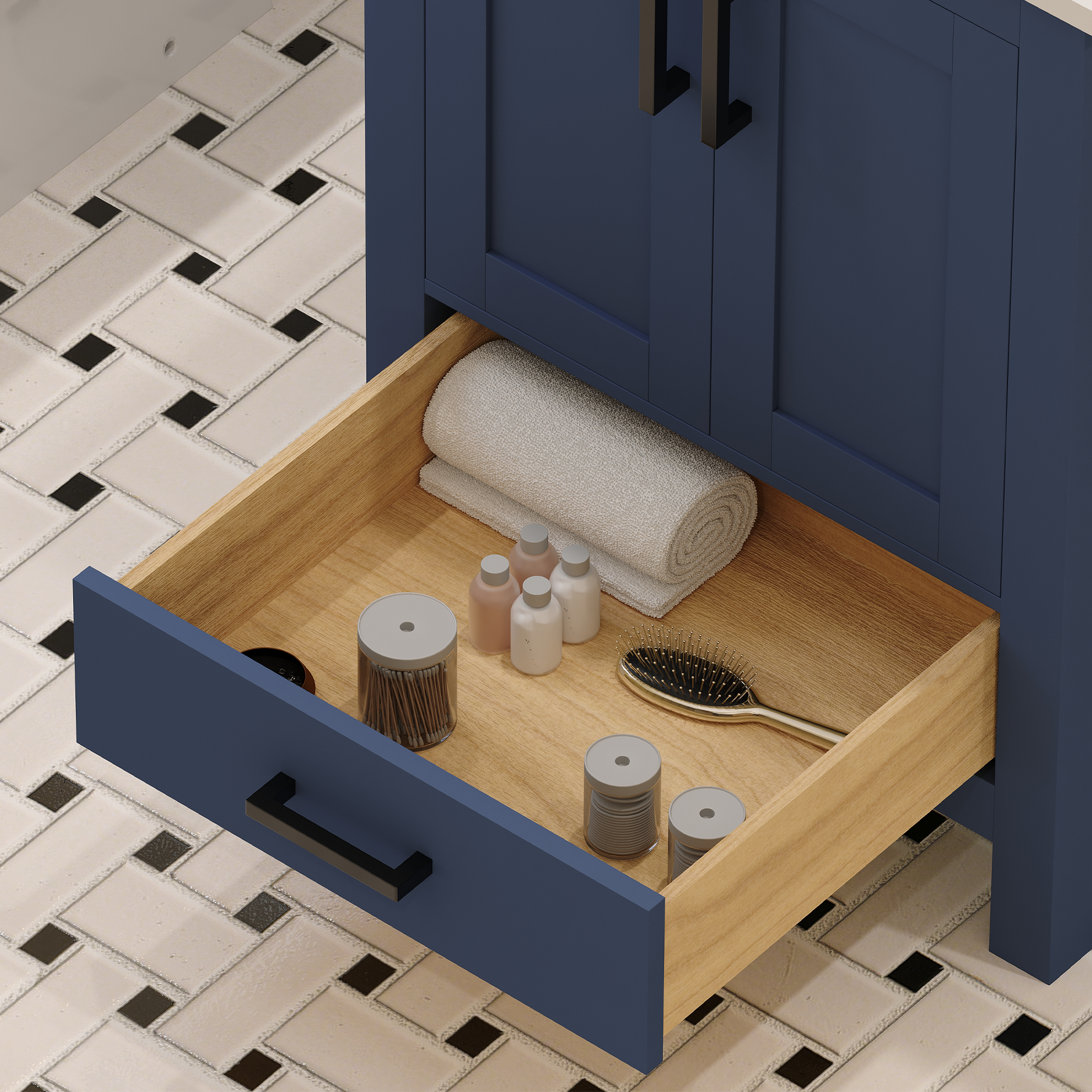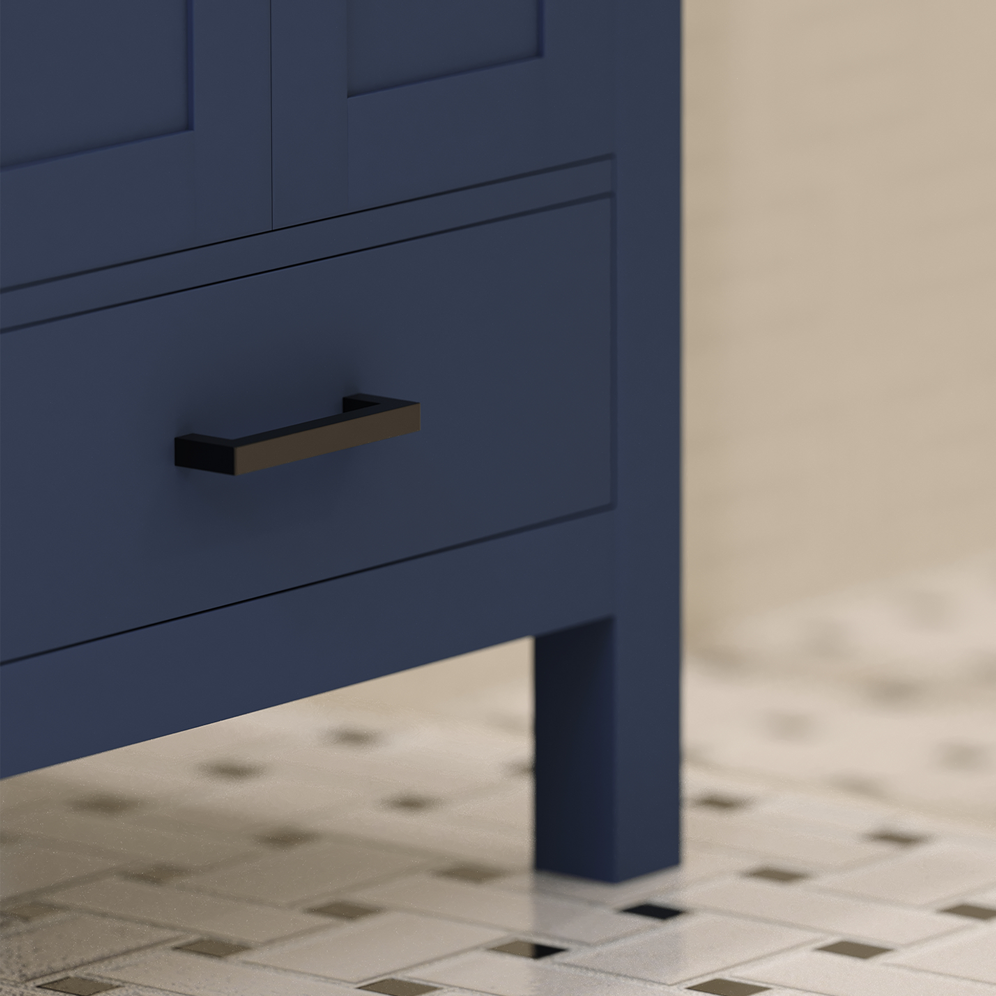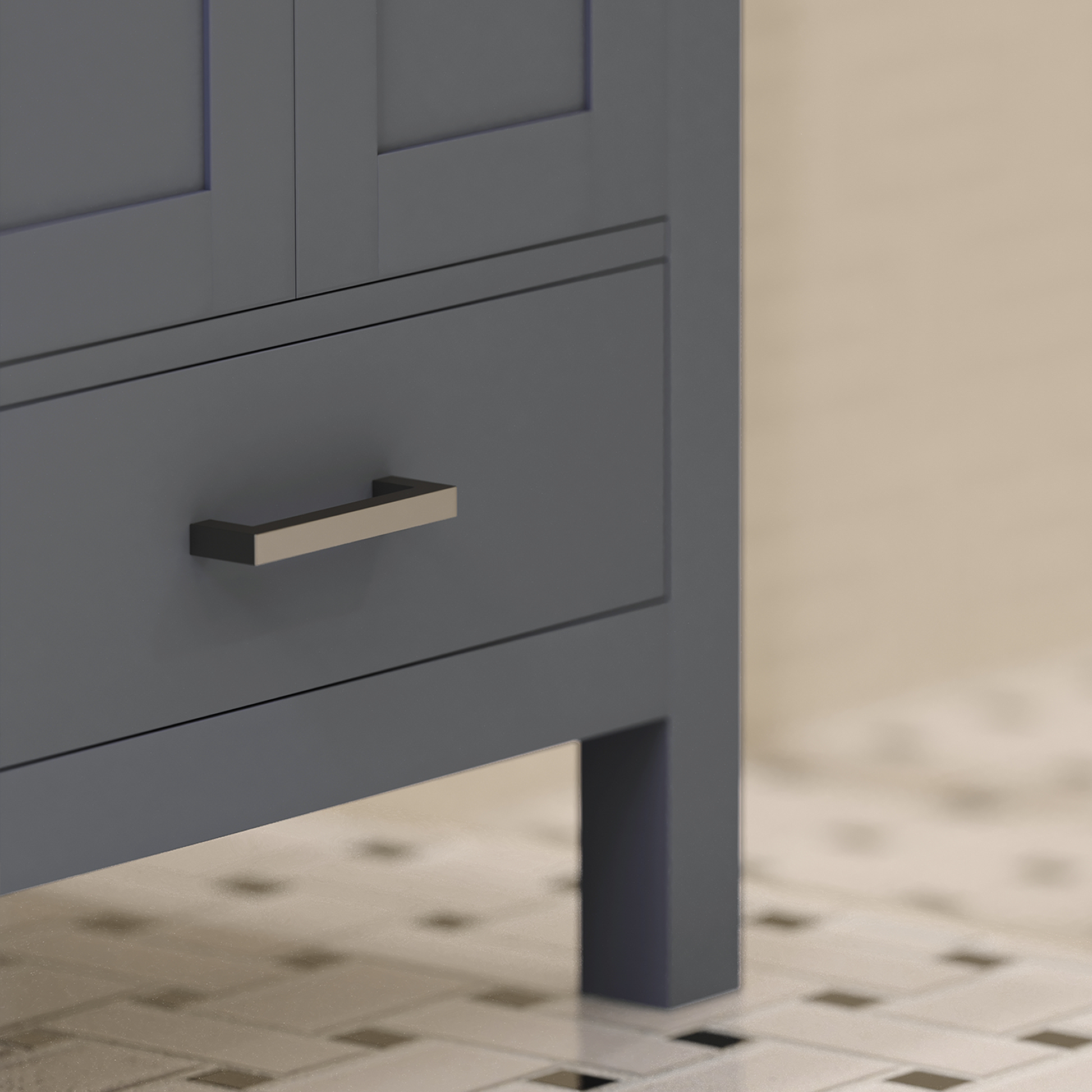 Features & Functionality: This bathroom vanity has a standard but highly convenient design, designed for modern American homes. Complete with smart-closing hinges and high density, sound resistant drawers. The large drawers fit all the modern toiletries, such as electric toothbrushes, skincare organizers, hair styling tools, luxurious bath products, etc. Its straight legs include adjustable levelers, which make accurate height adjustment on an uneven floor possible. This further stabilizes the vanity, prevents wobbling, and contributes to its durability, making it a stylish and practical addition to every contemporary bath space.