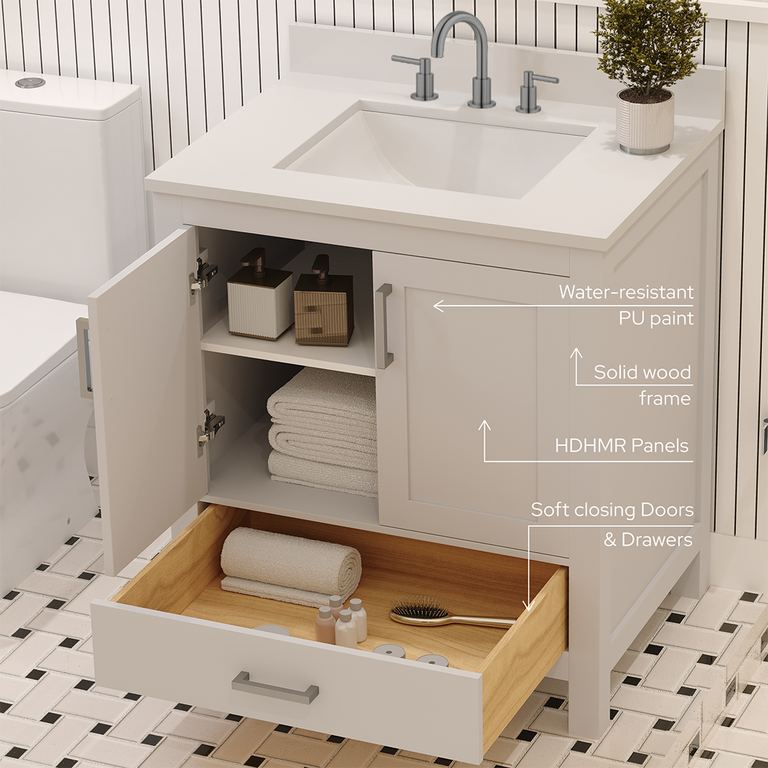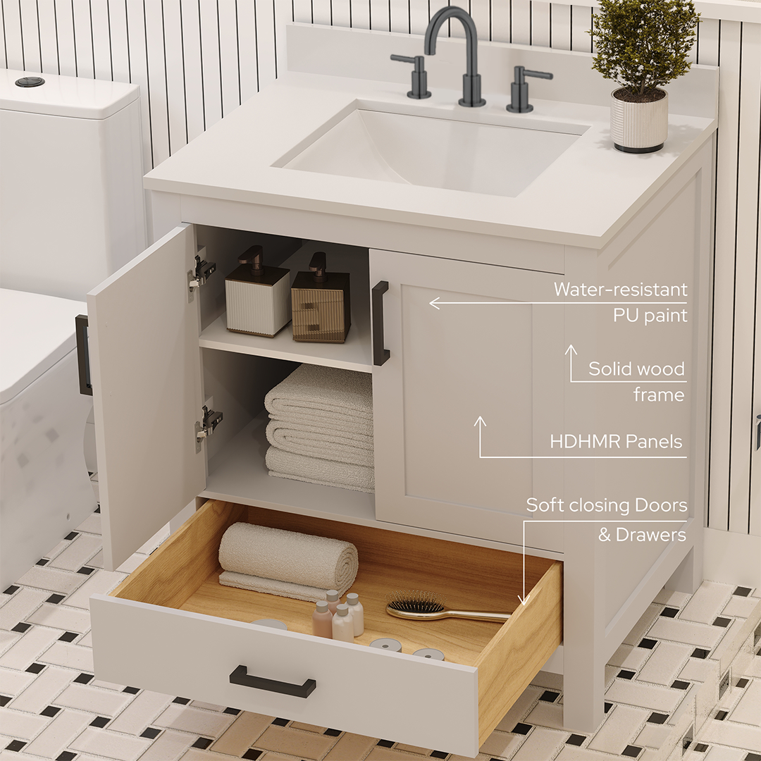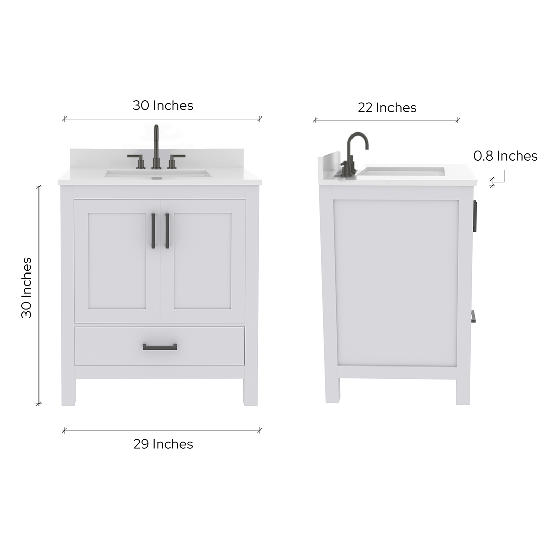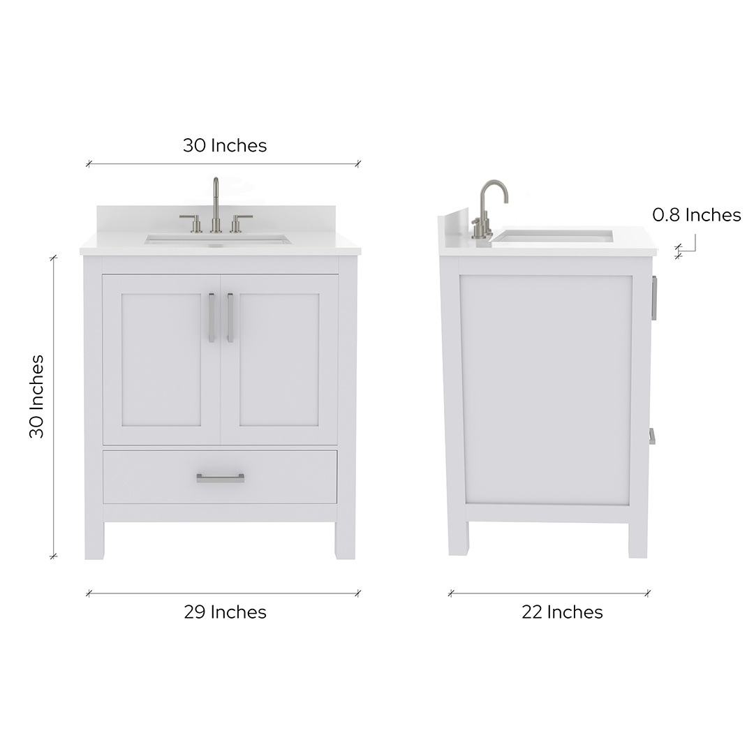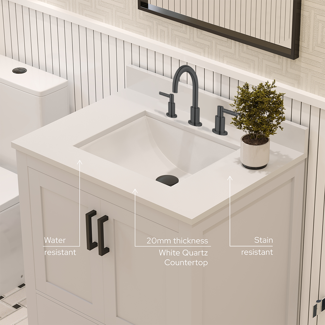 Rooh 30 Inch Solid Wood Bathroom Vanity with Undermount single Rectangle sink & White Quartz countertop 0.75 inch edge in white