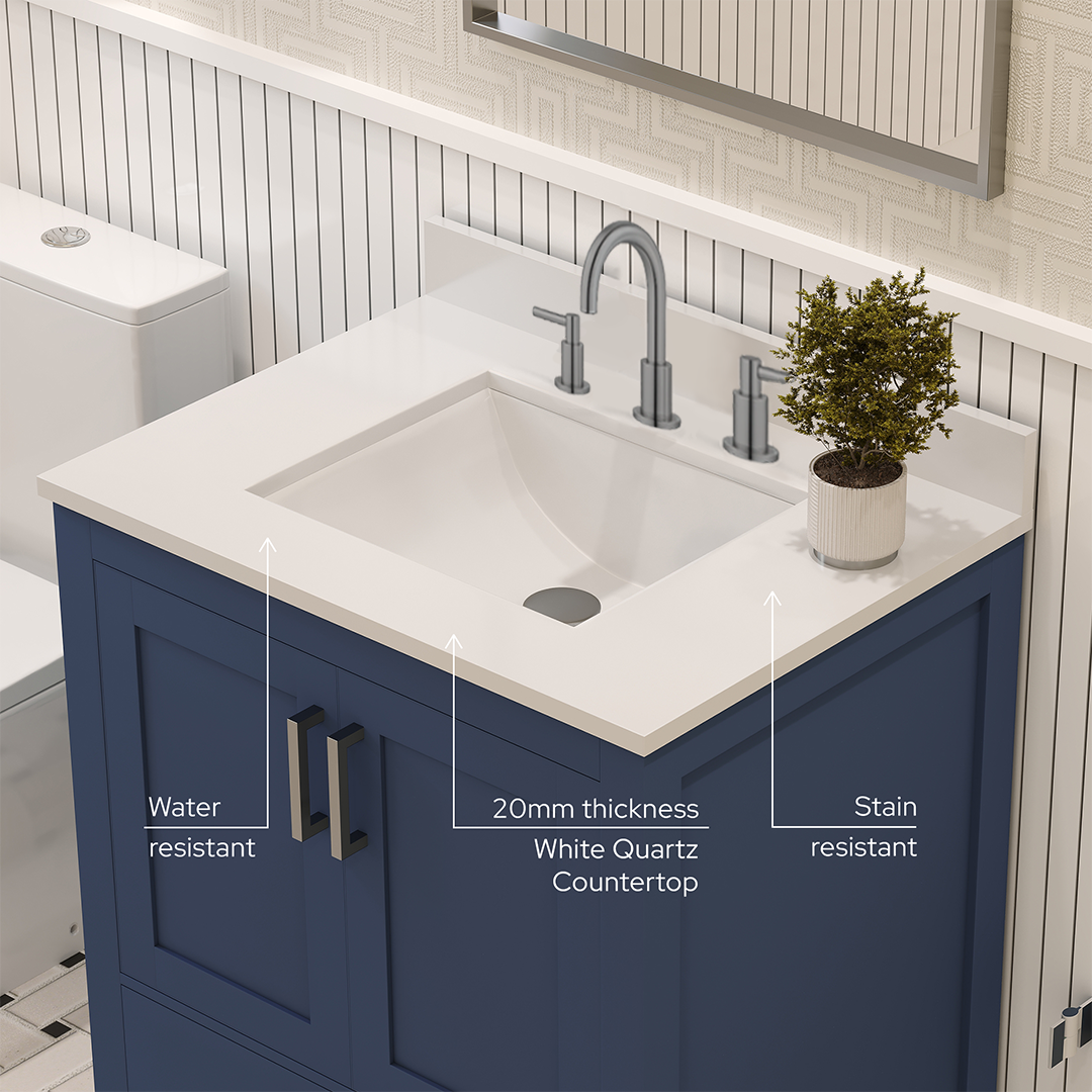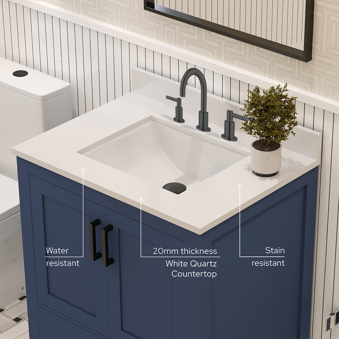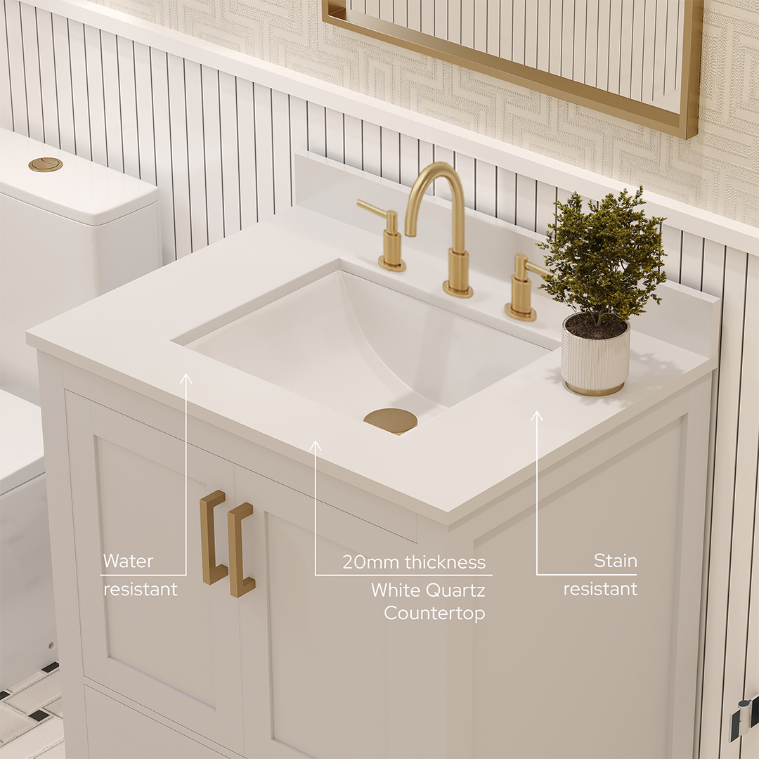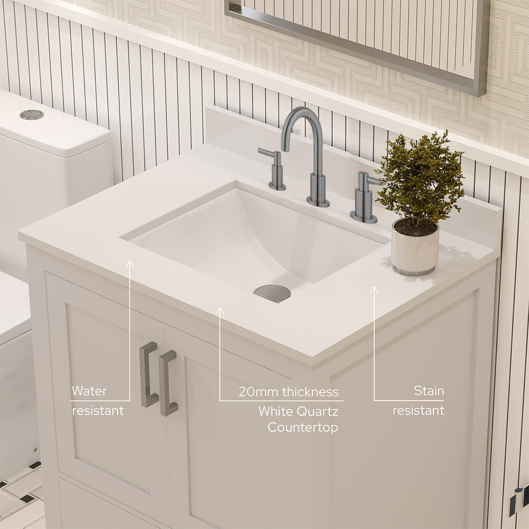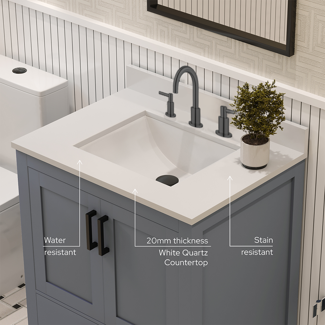 Rooh 30 Inch Solid Wood Bathroom Vanity with Undermount single Rectangle sink & White Quartz countertop 0.75 inch edge in white