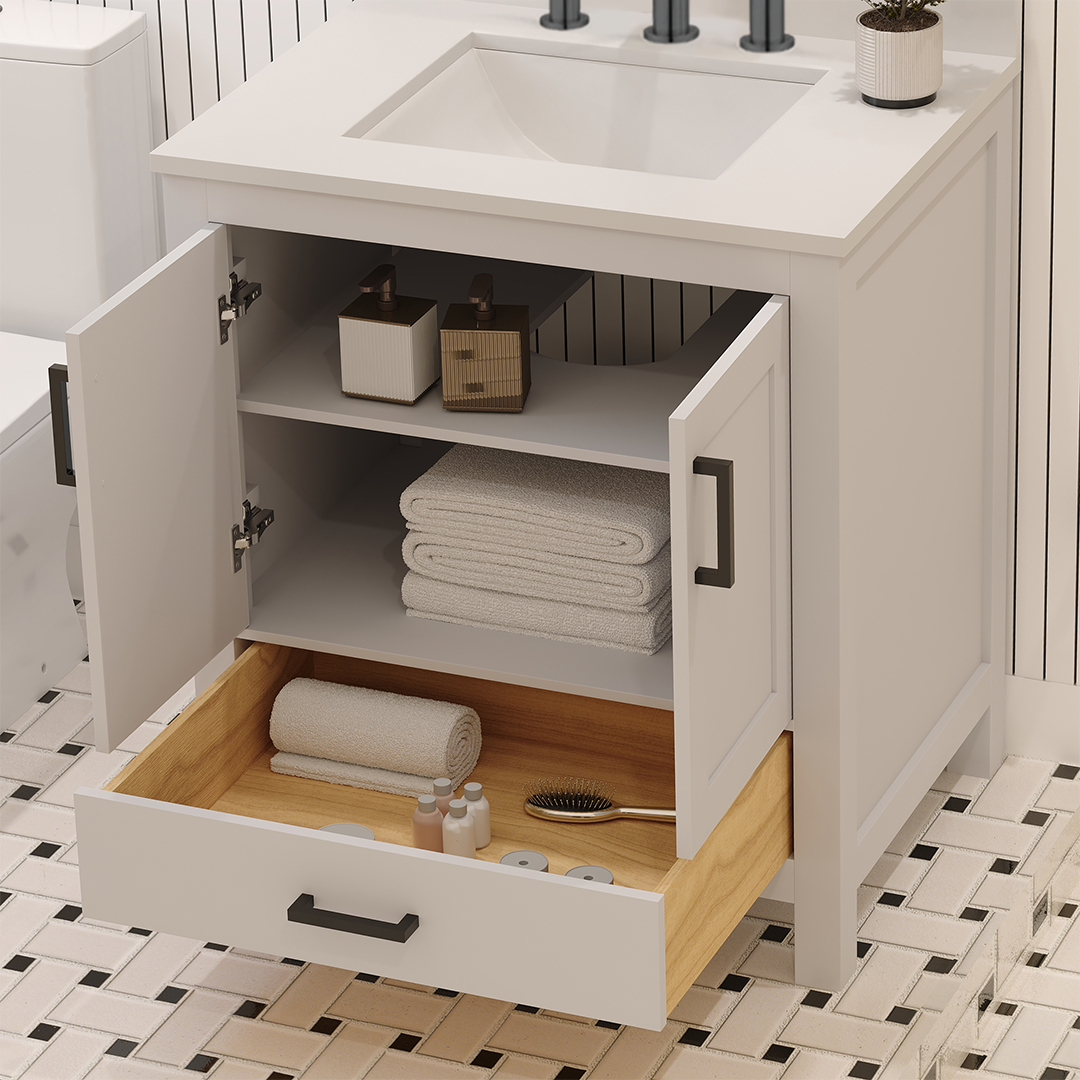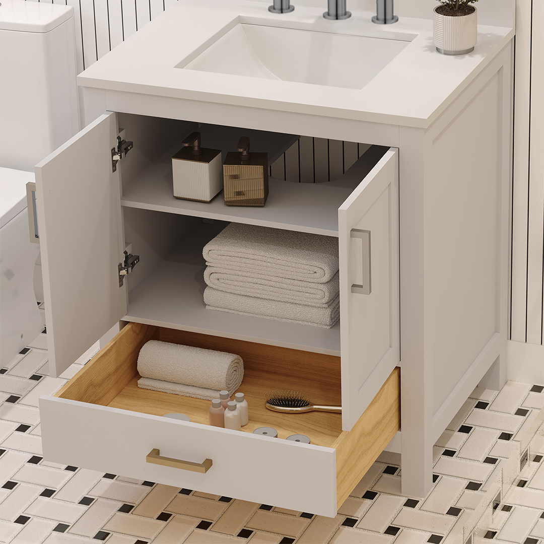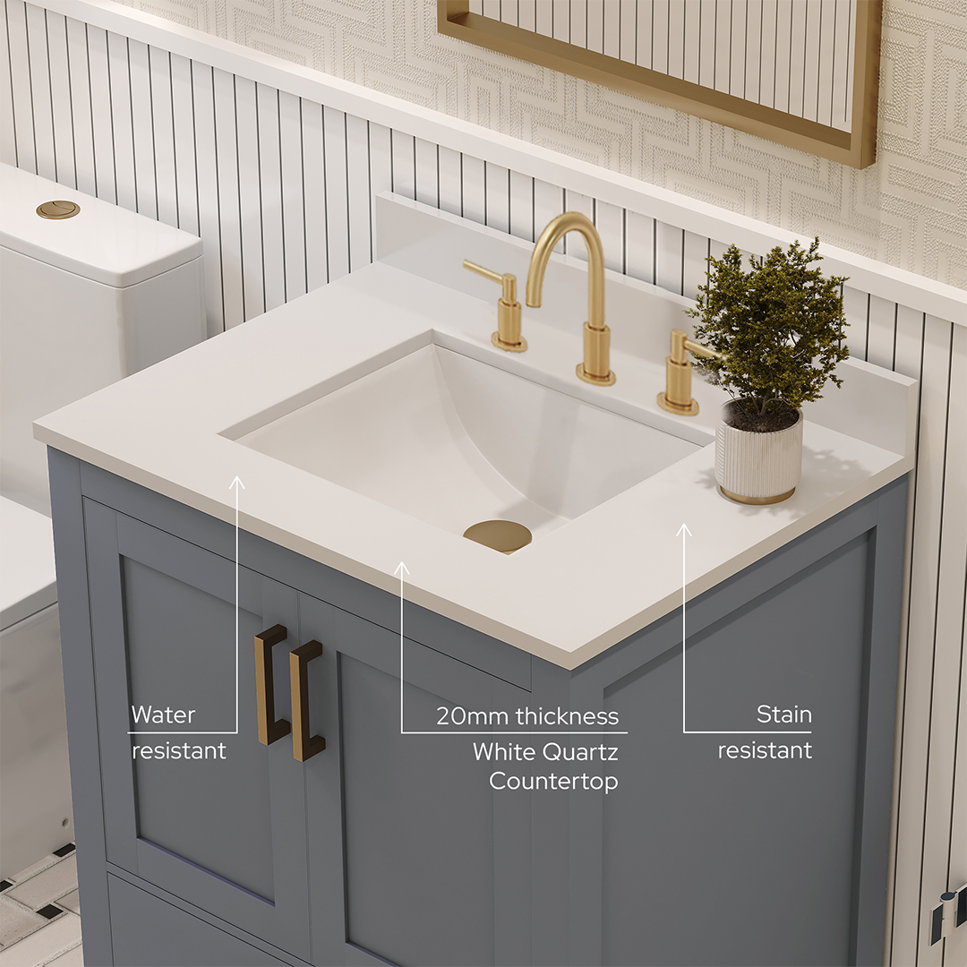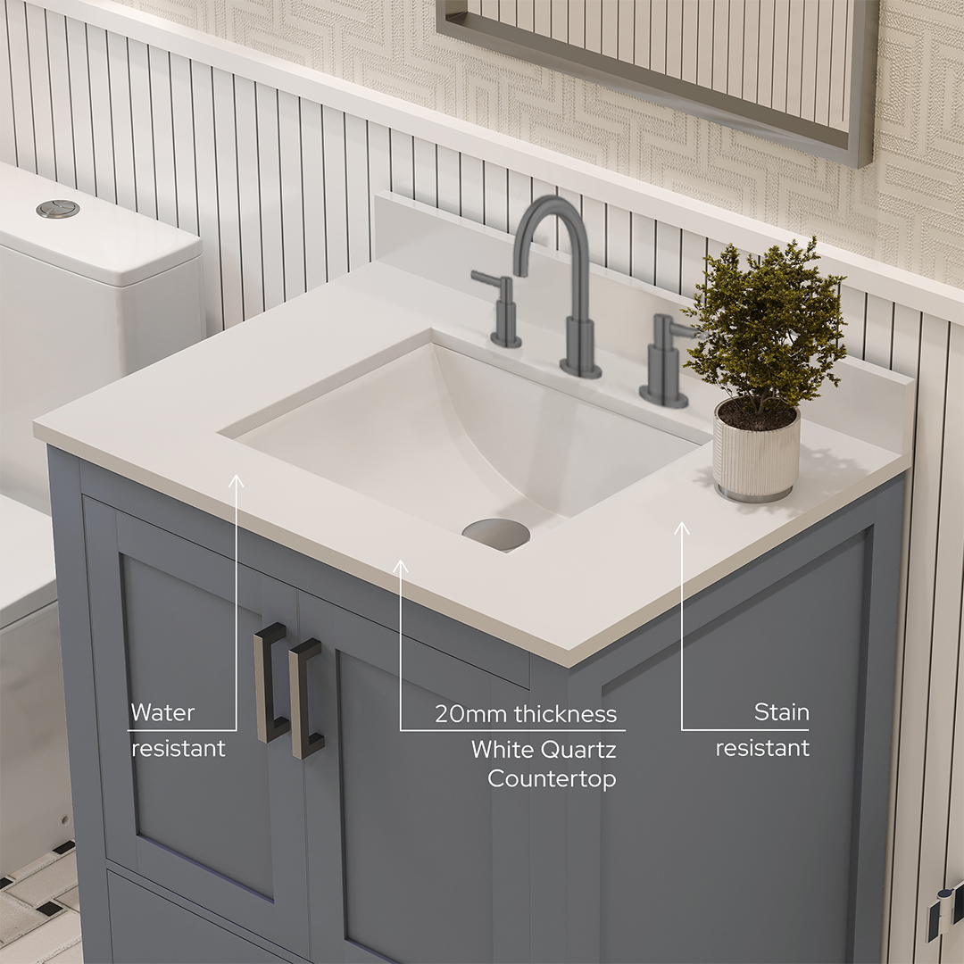 Rooh 30 Inch Solid Wood Bathroom Vanity with Undermount single Rectangle sink & White Quartz countertop 0.75 inch edge in white