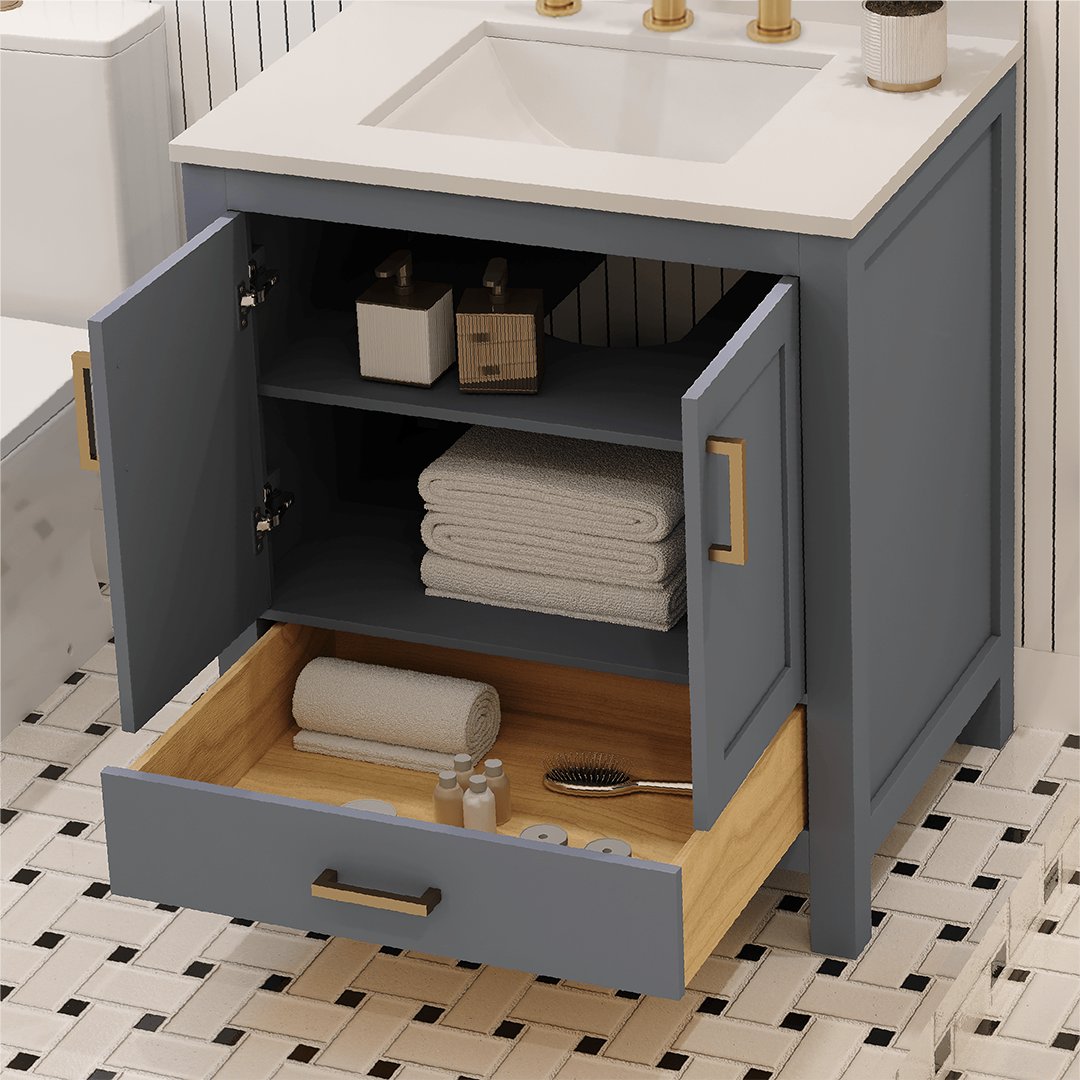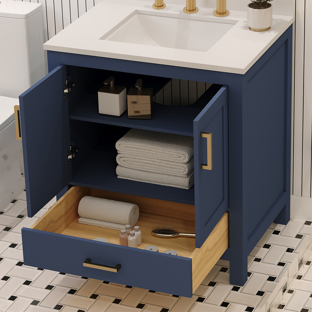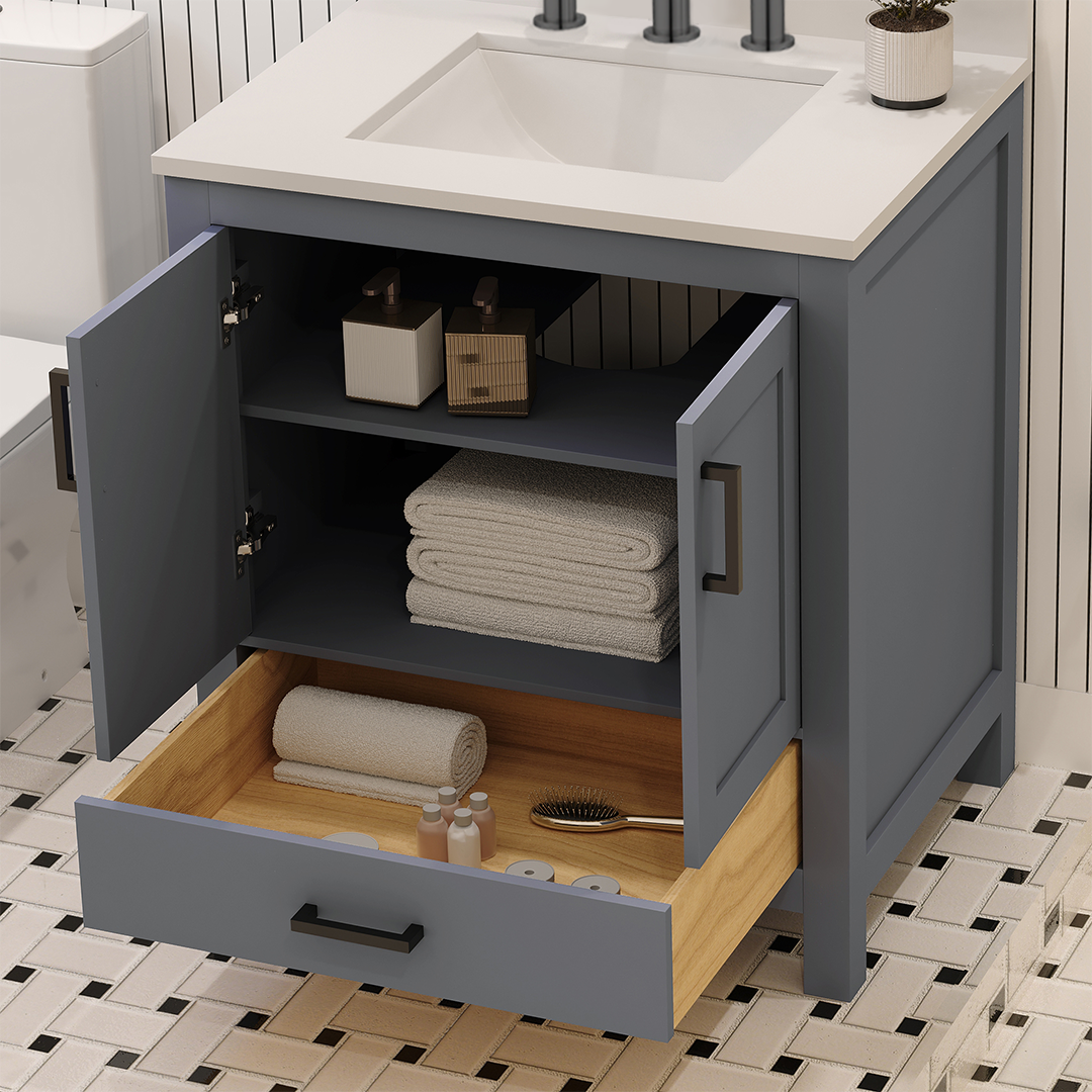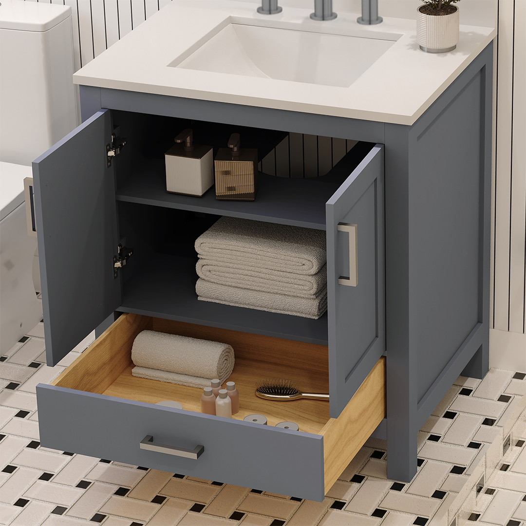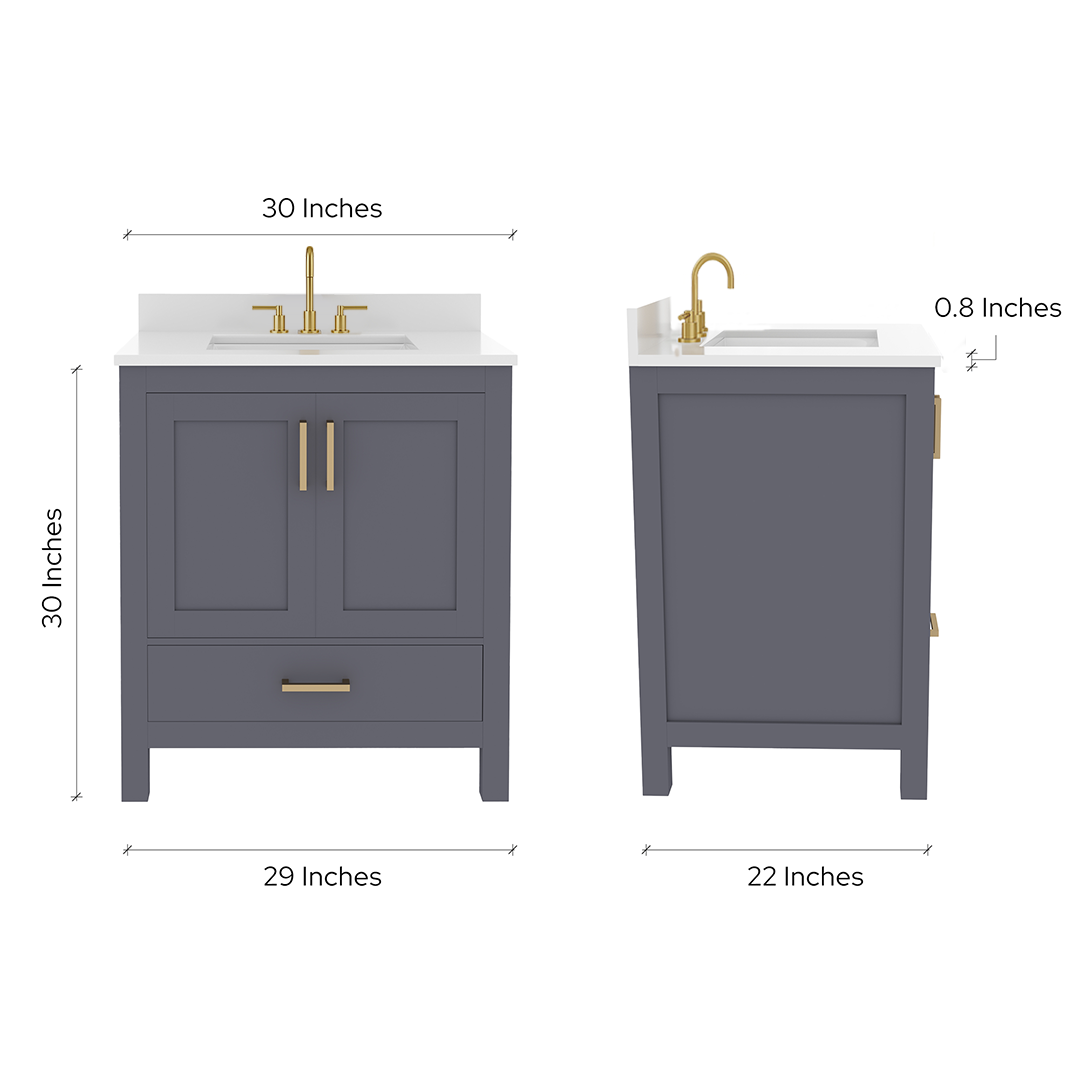 Rooh 30 Inch Solid Wood Bathroom Vanity with Undermount single Rectangle sink & White Quartz countertop 0.75 inch edge in white