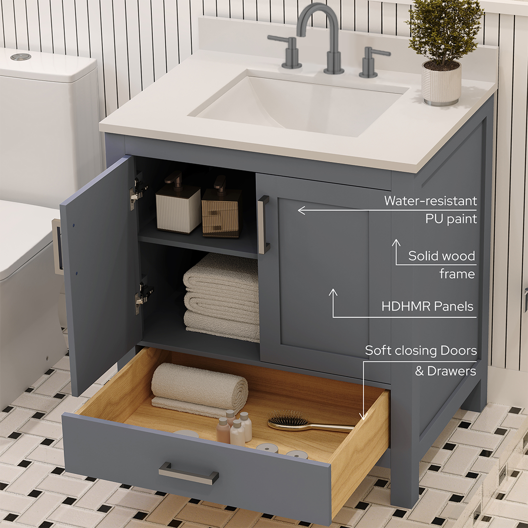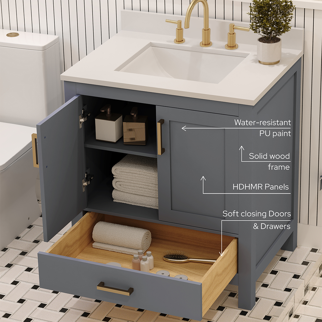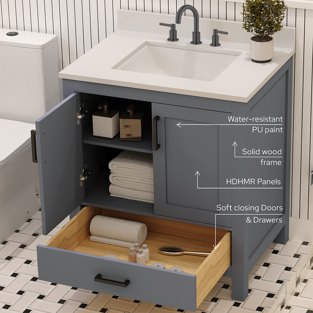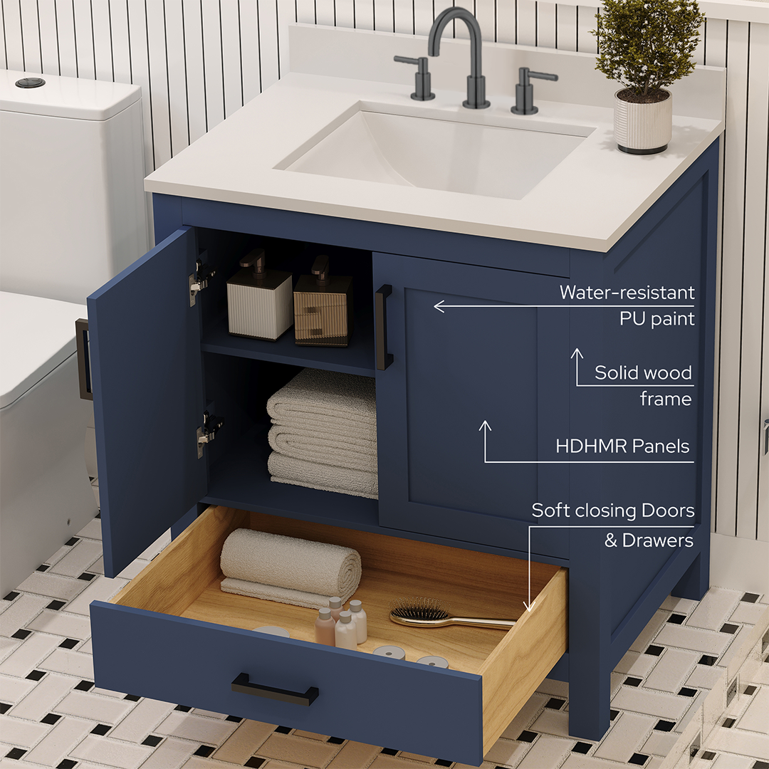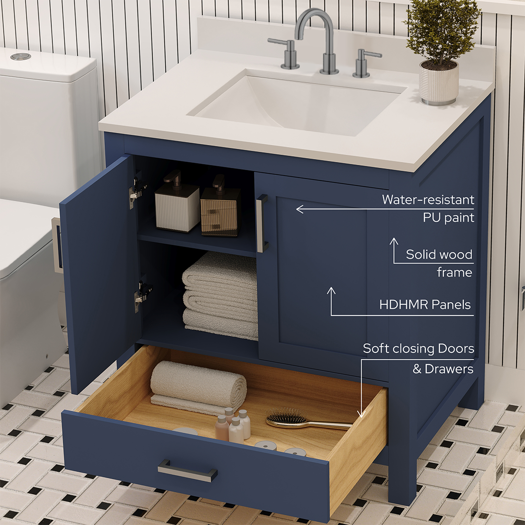 Material & Build: This 30” W x 22” D x 32.75” H wooden bathroom vanity is made of a solid natural wood material frame for strength and long-lasting durability. The HDHMR wood panels are a premium engineered wood that offers superior durability and moisture resistance, making it suitable for long term use in humid conditions. This 30-inch bathroom vanity is hand finished with a 8 stage Sherwin Williams painting process, which guarantees excellent durability, moisture resistance, and long-wear protection.