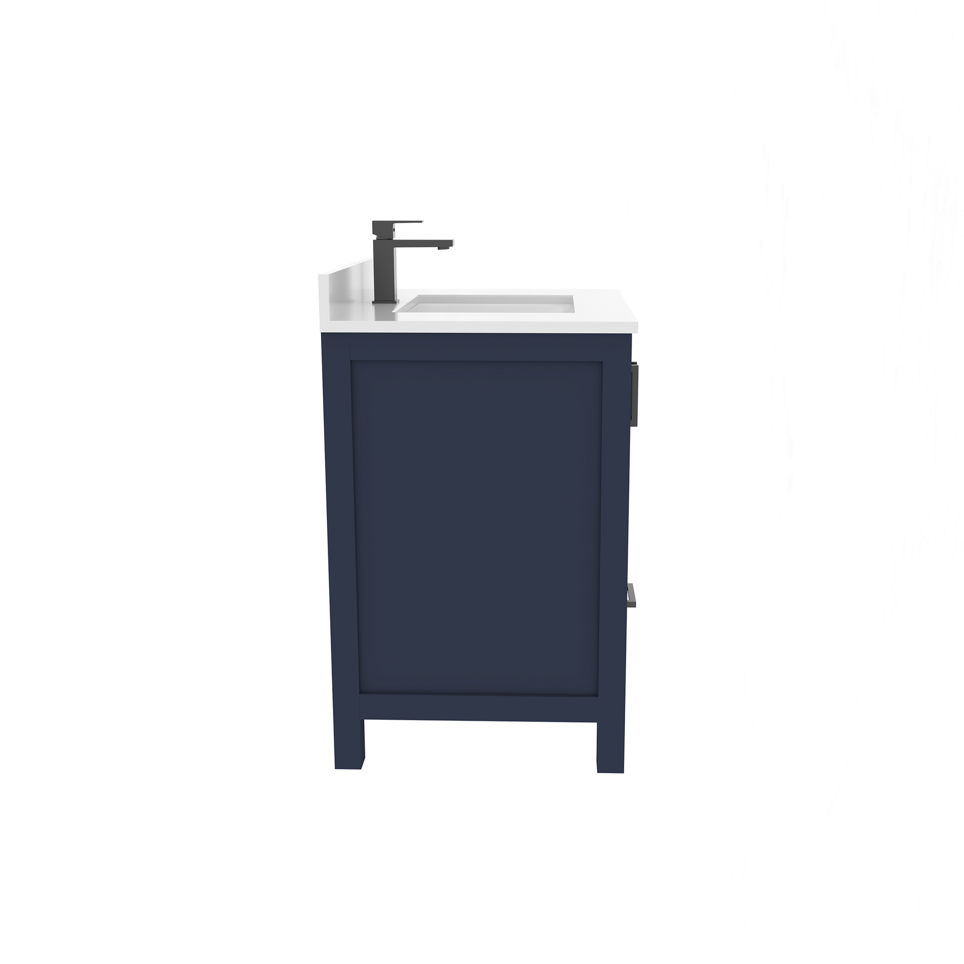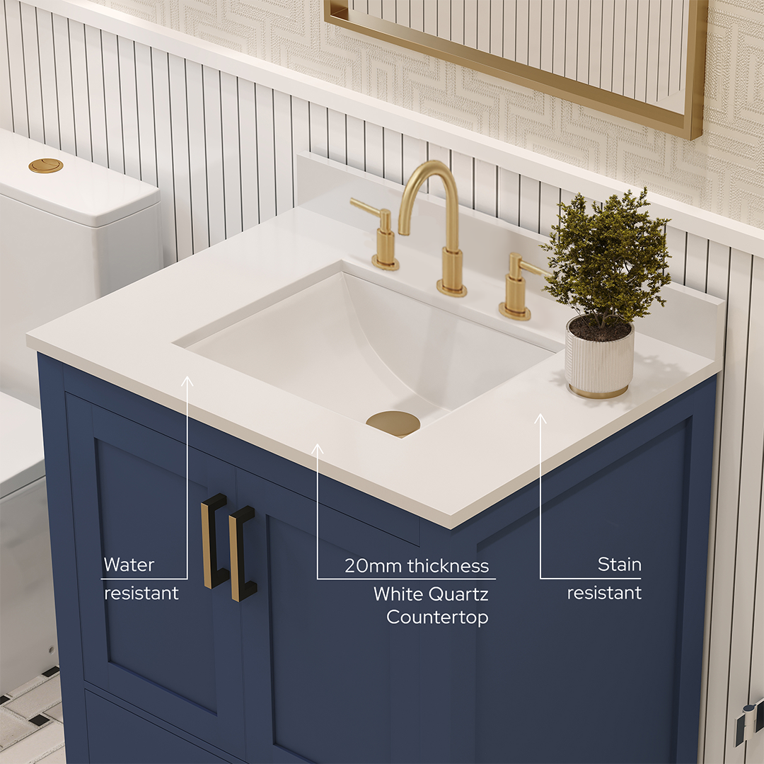 Countertop & Sink: Topped with a stain resistant quartz countertop features a single rectangular modern ceramic sink that adds style and functionality to your bathroom and making it simple to maintain. For that high end look and feel, white quartz provides a luxurious non-porous, surface that resistant to moisture, stains and fog. The countertop is complete with a matching, cohesive backsplash that protects your walls from water damage. Unlike MDF or particleboard vanities, our products are produced with 100% recyclable eco certified materials. This not only makes it a greener choice, but also a lifelong investment that will beautify your space for years to come.