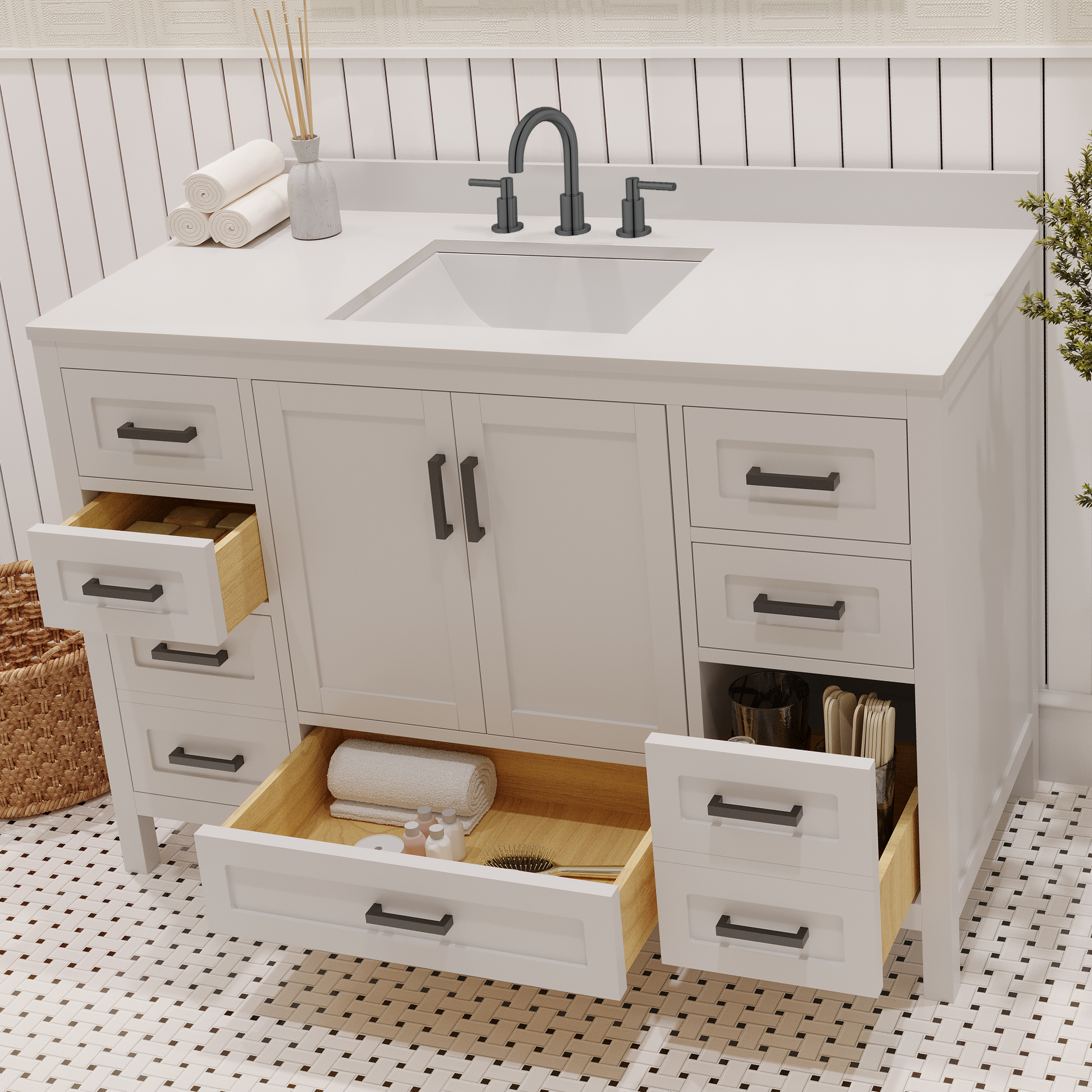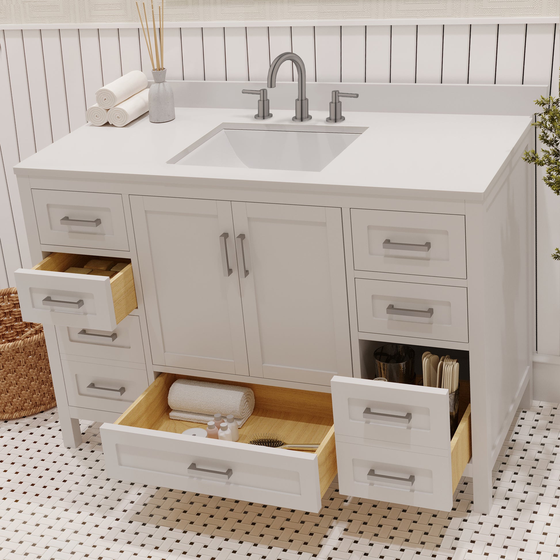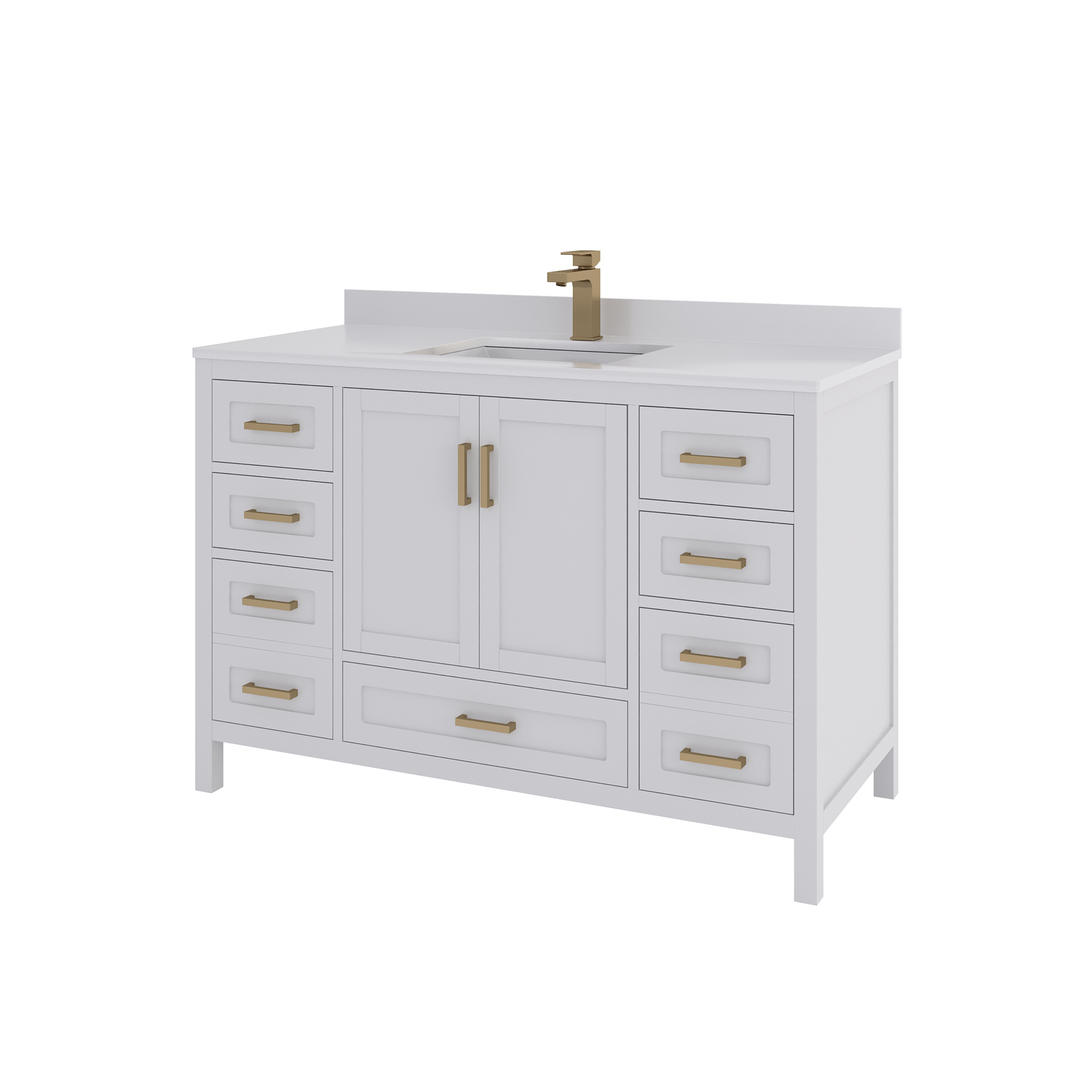 Rooh 48 Inch Solid Wood Bathroom Vanity with Undermount single Rectangle sink & White Quartz countertop 0.75 inch edge in white