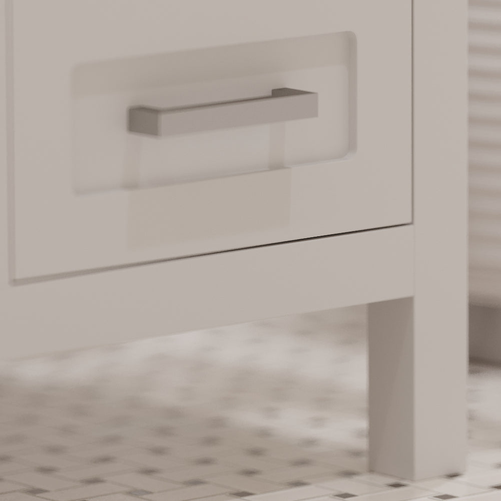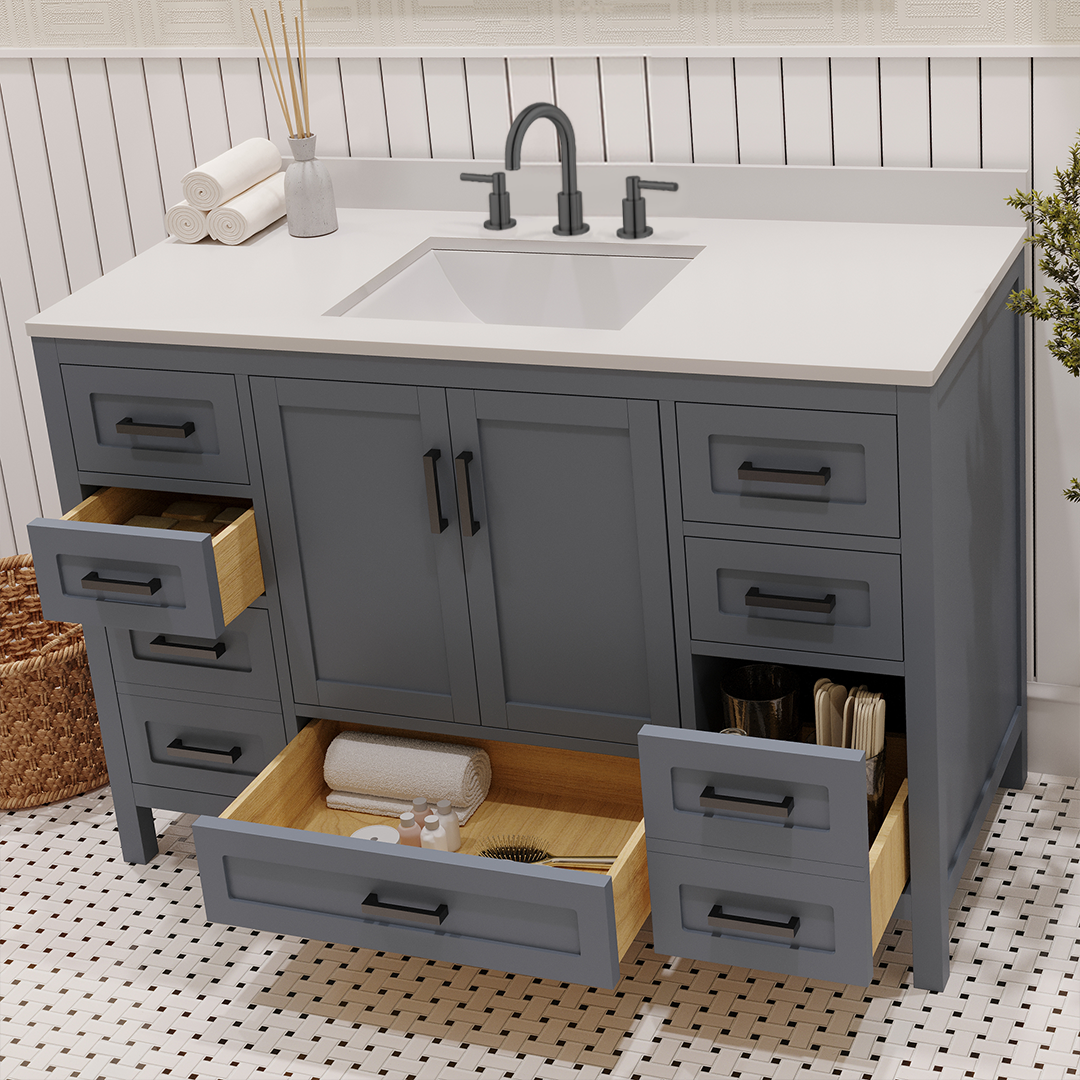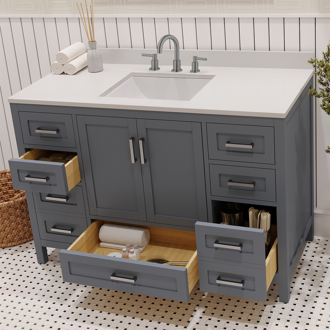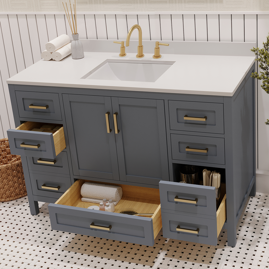 Features & Functionality: This bathroom vanity has a standard but highly convenient design, designed for modern American homes. Complete with smart-closing hinges and high density, sound resistant drawers. The large drawers fit all the modern toiletries, such as electric toothbrushes, skincare organizers, hair styling tools, luxurious bath products, etc. Its straight legs include adjustable levelers, which make accurate height adjustment on an uneven floor possible. This further stabilizes the vanity, prevents wobbling, and contributes to its durability, making it a stylish and practical addition to every contemporary bath space.