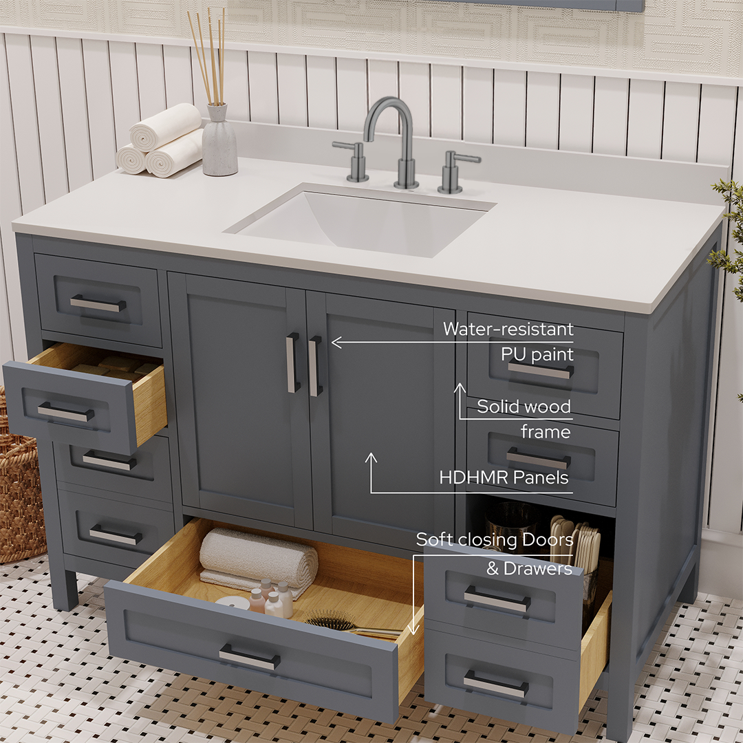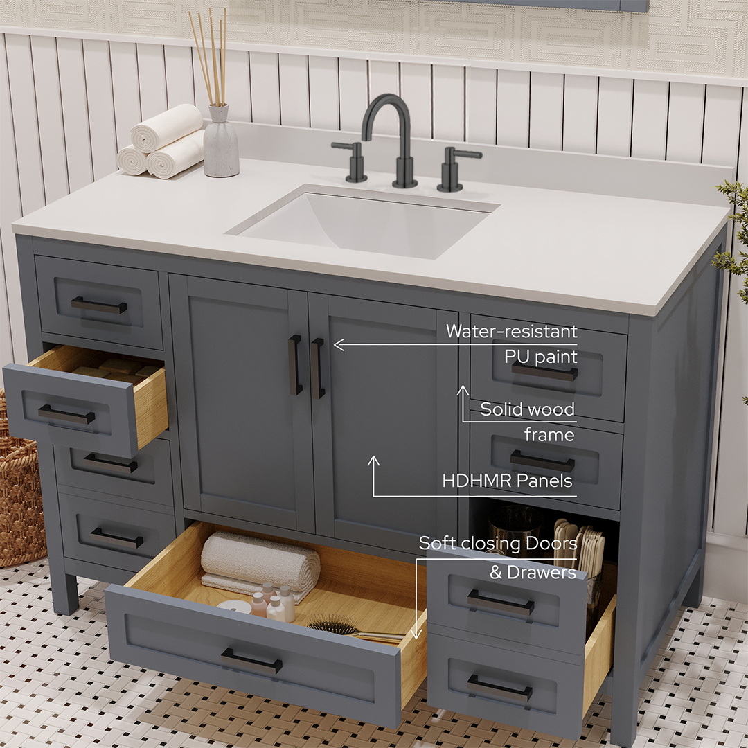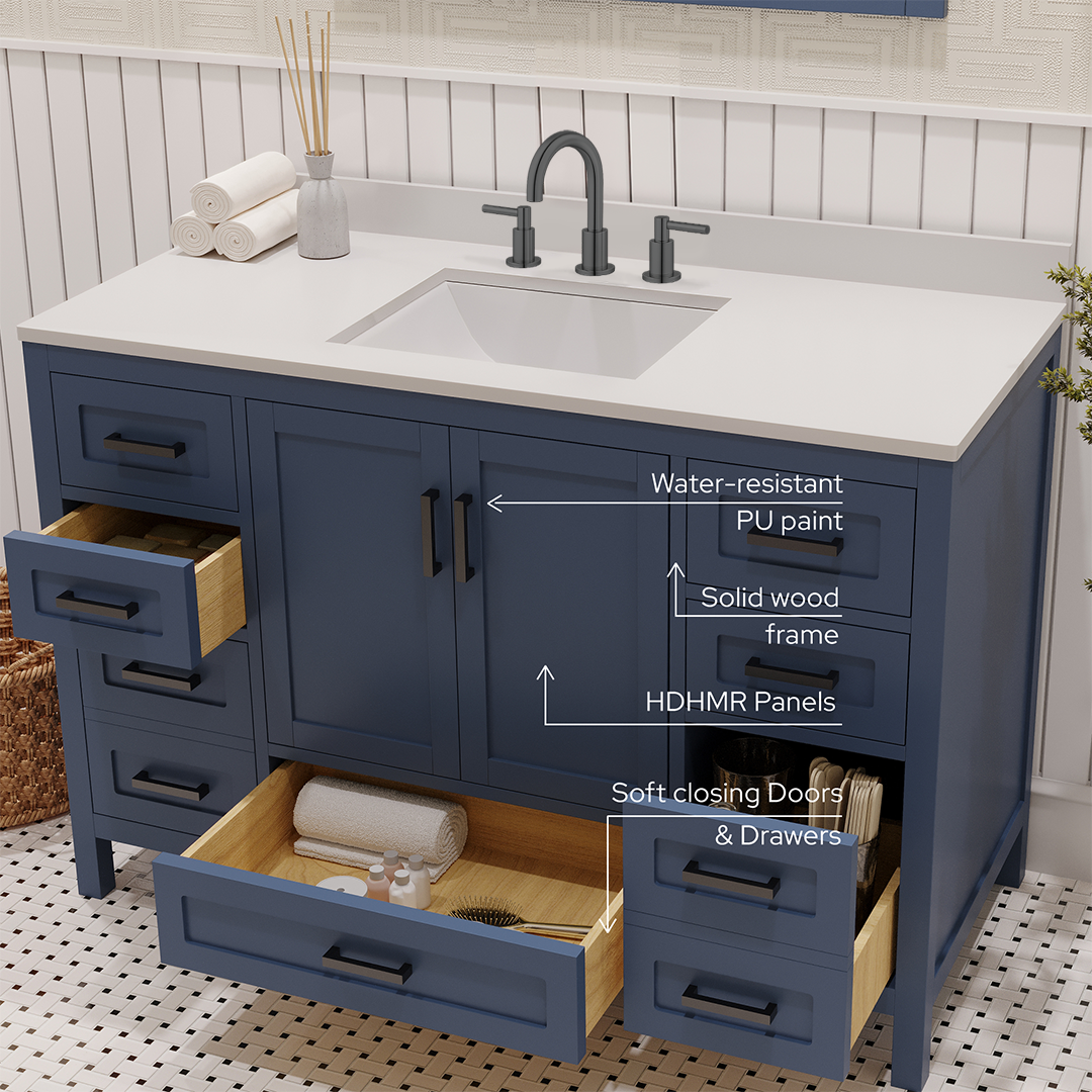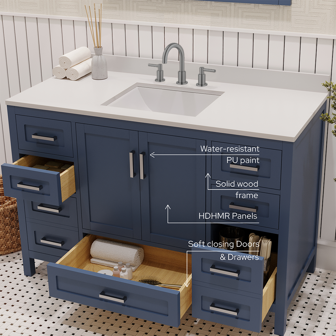 Material & Build: This 48” W x 22” D x 32.75”H - wooden bathroom vanity is made of a solid natural wood material frame for strength and long-lasting durability. The HDHMR wood panels are a premium engineered wood that offers superior durability and moisture resistance, making it suitable for long term use in humid conditions. This 48-inch bathroom vanity is hand finished with an 8 stage Sherwin Williams painting process, which guarantees excellent durability, moisture resistance, and long-wear protection.
