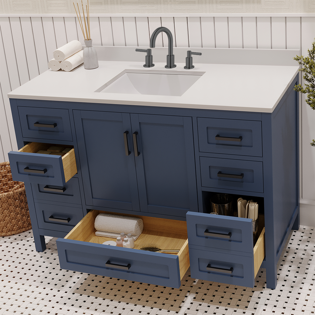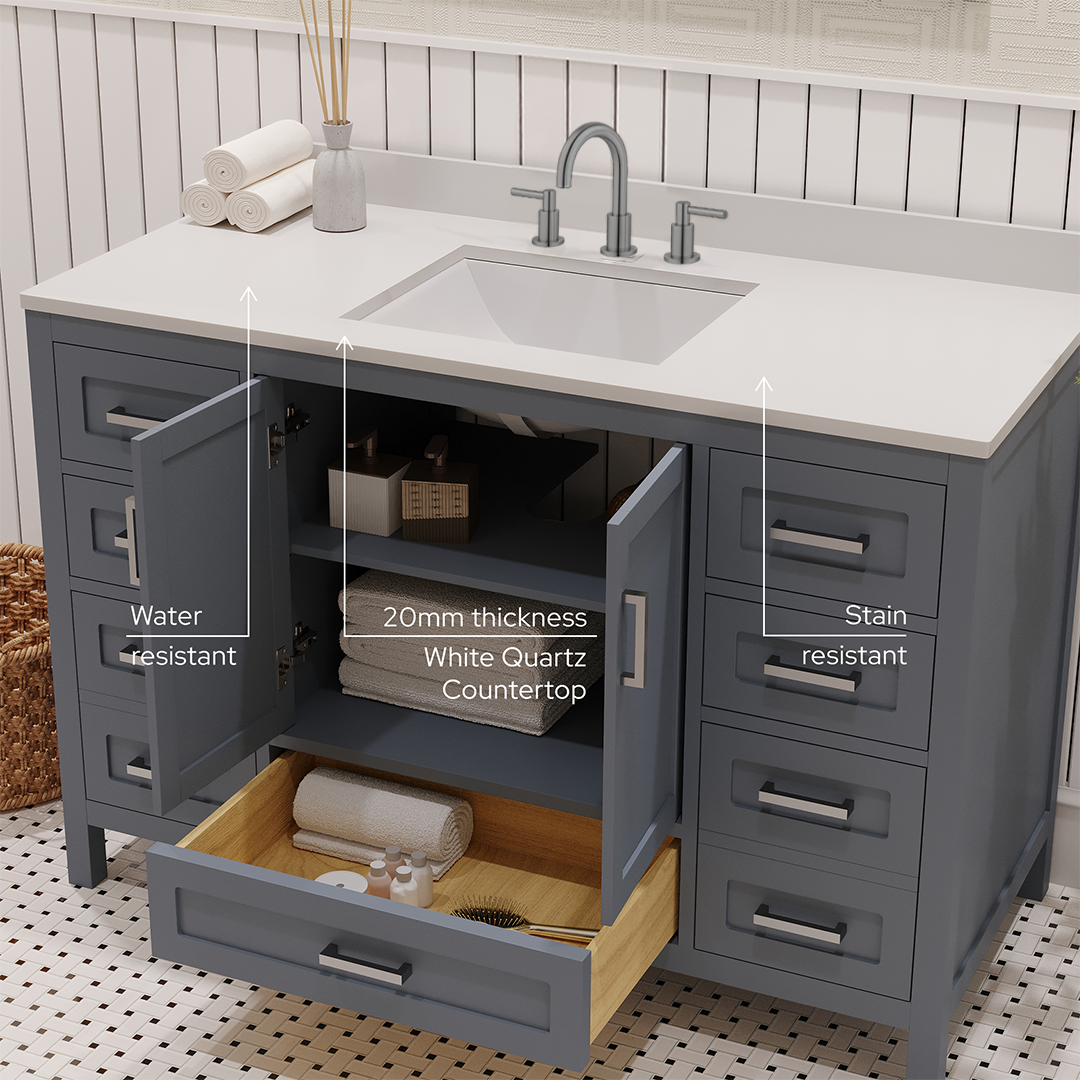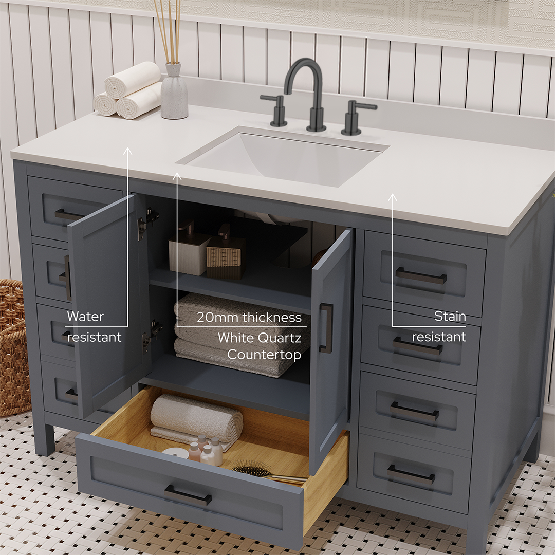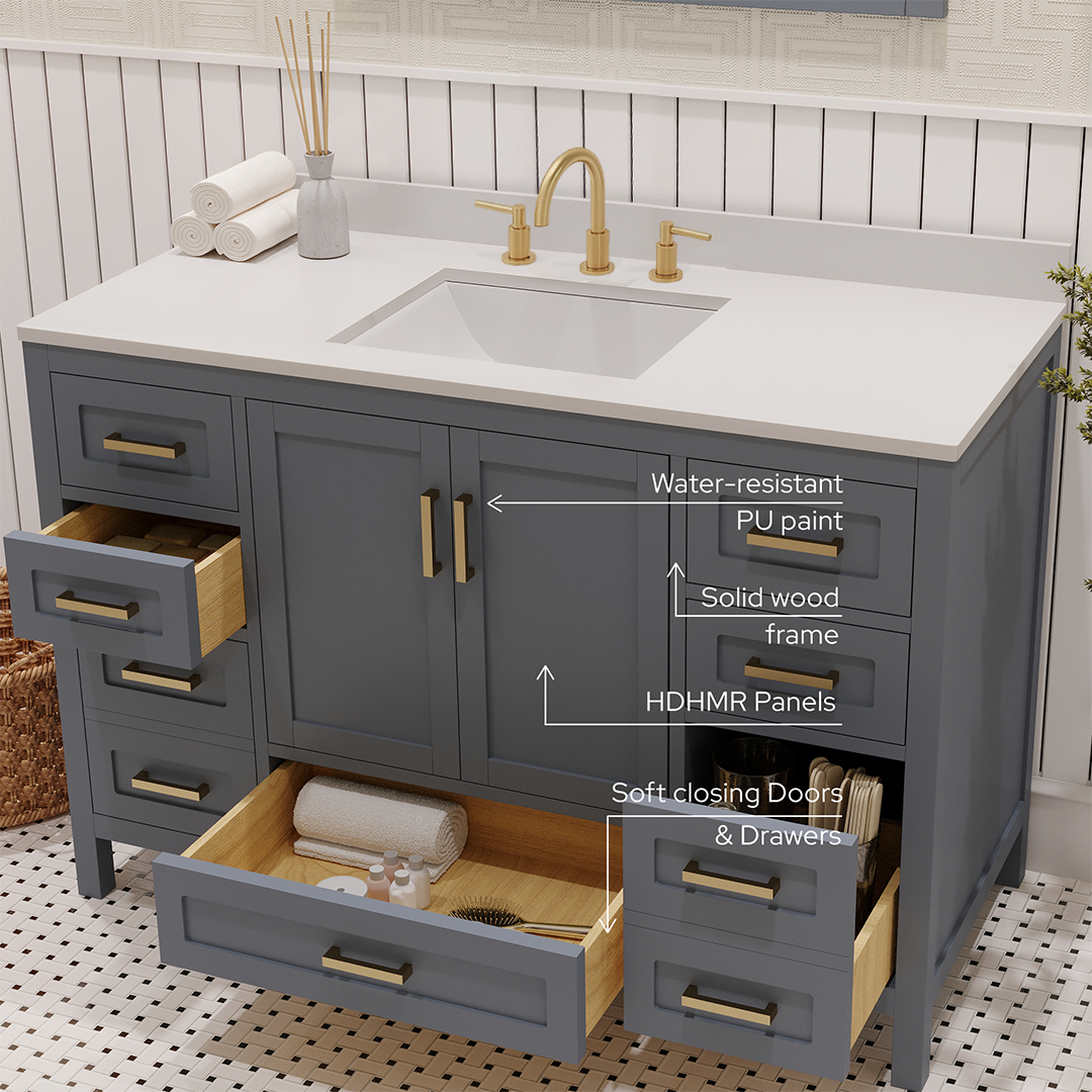 Material & Build: This 48” W x 22” D x 32.75”H - wooden bathroom vanity is made of a solid natural wood material frame for strength and long-lasting durability. The HDHMR wood panels are a premium engineered wood that offers superior durability and moisture resistance, making it suitable for long term use in humid conditions. This 48-inch bathroom vanity is hand finished with an 8 stage Sherwin Williams painting process, which guarantees excellent durability, moisture resistance, and long-wear protection.