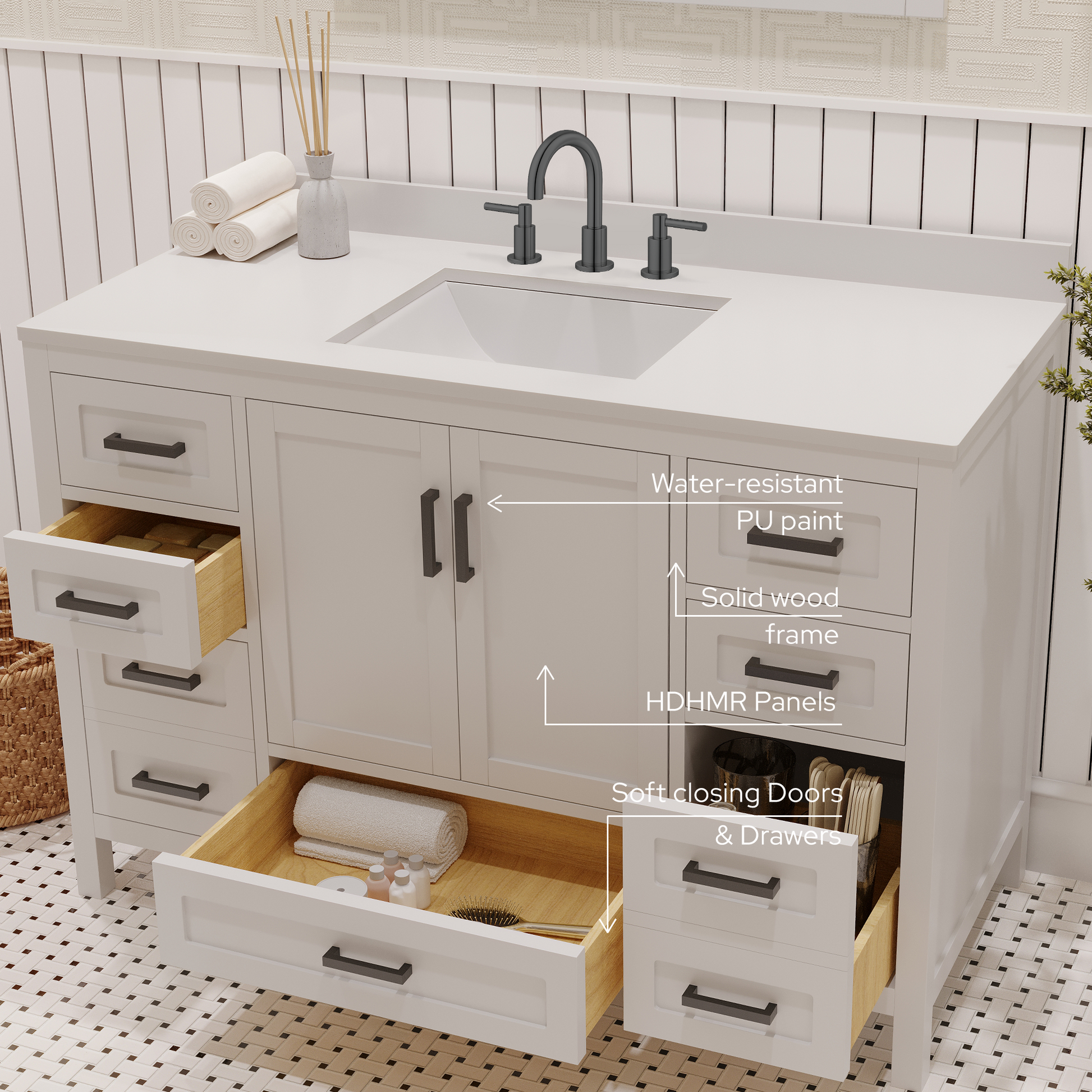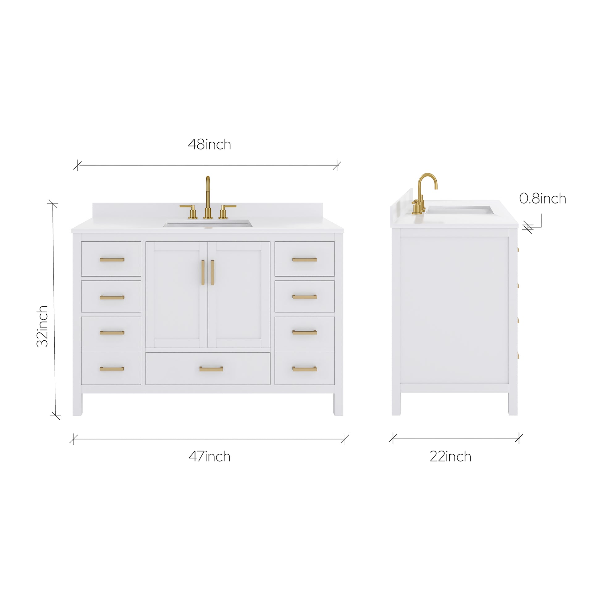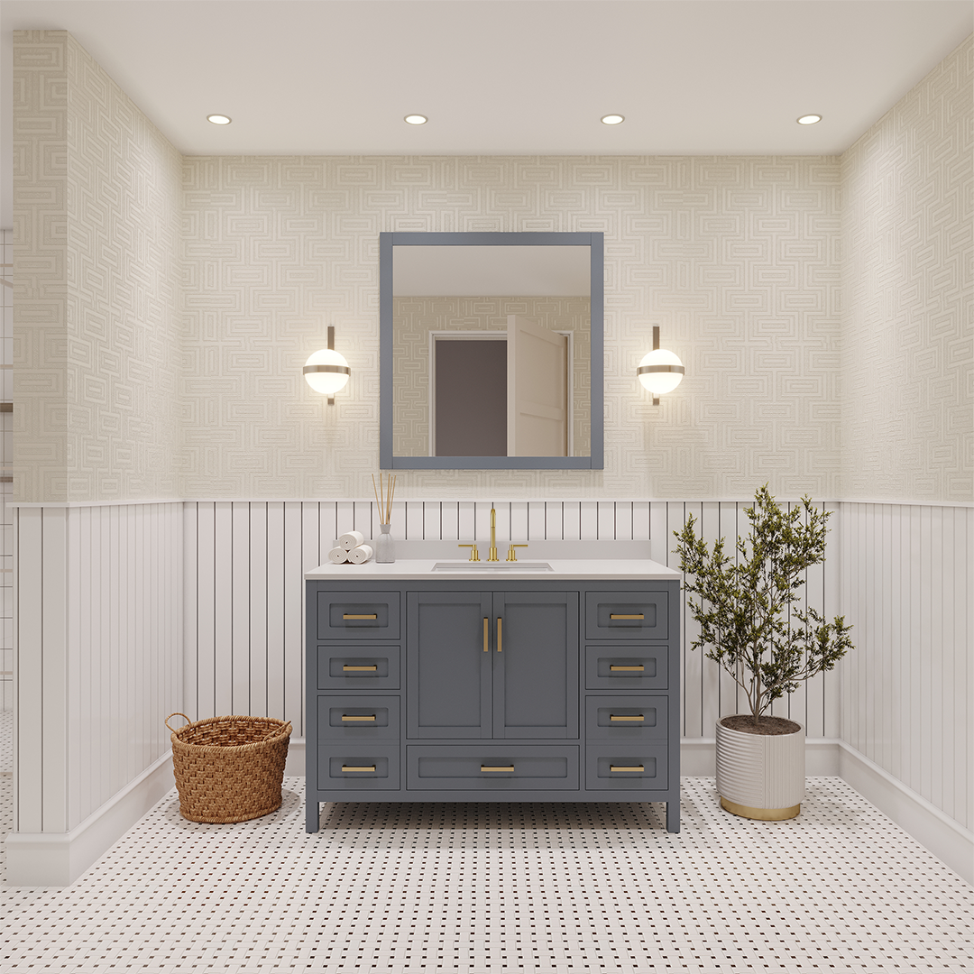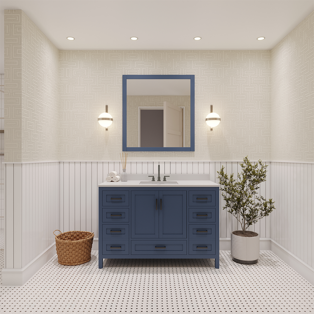 Material & Build: This 48” W x 22” D x 32.75”H - wooden bathroom vanity is made of a solid natural wood material frame for strength and long-lasting durability. The HDHMR wood panels are a premium engineered wood that offers superior durability and moisture resistance, making it suitable for long term use in humid conditions. This 48-inch bathroom vanity is hand finished with an 8 stage Sherwin Williams painting process, which guarantees excellent durability, moisture resistance, and long-wear protection.