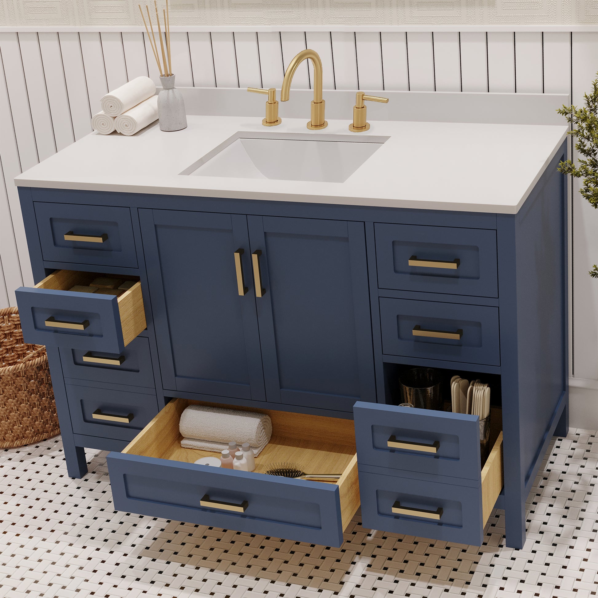 The natural wood bathroom vanity drawer combines functionality and style, offering ample storage for toiletries and towels. Its warm finish adds tranquility and sophistication, while smooth operation enhances convenience and enjoyment.