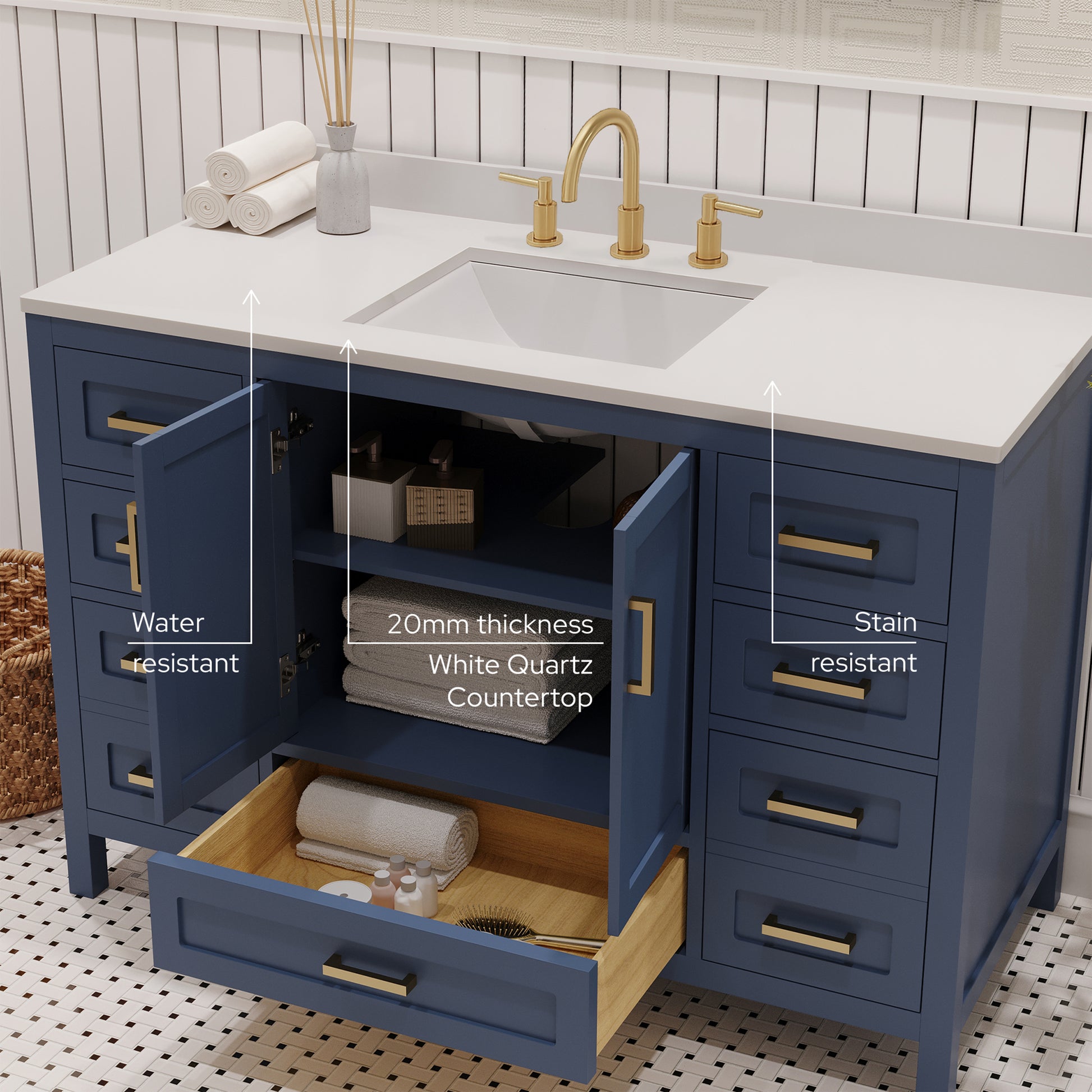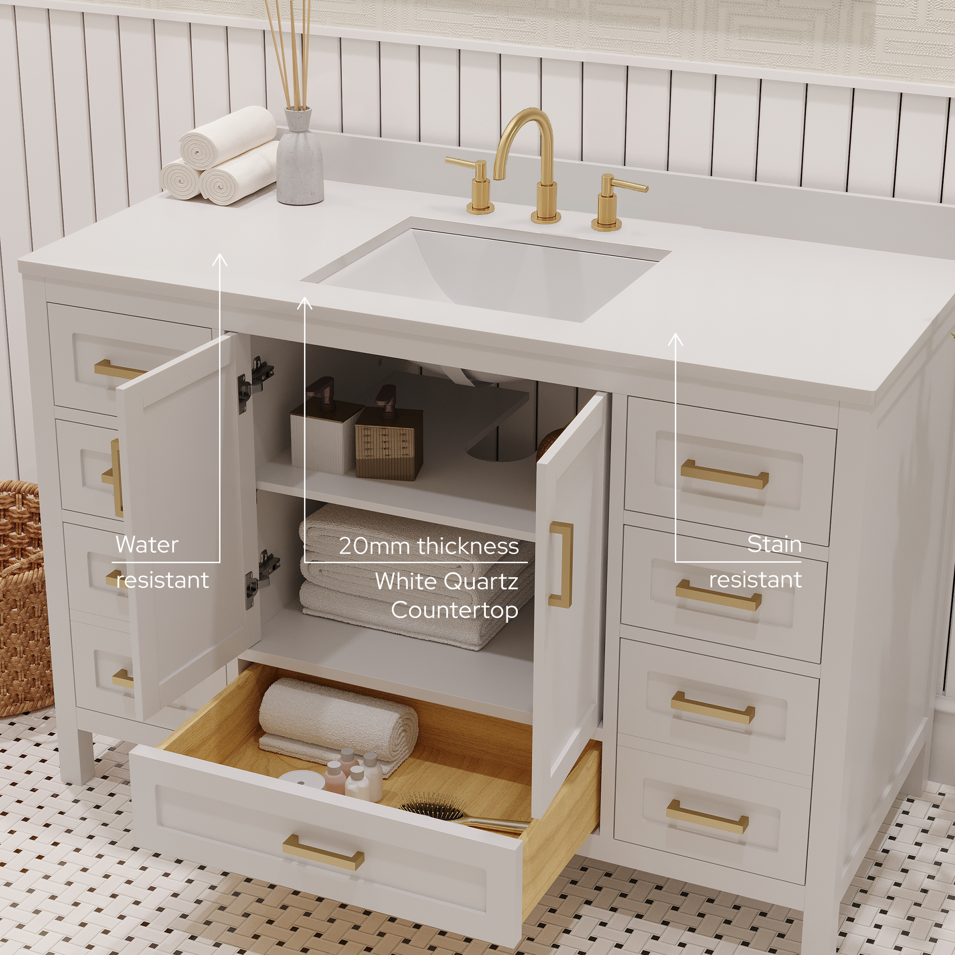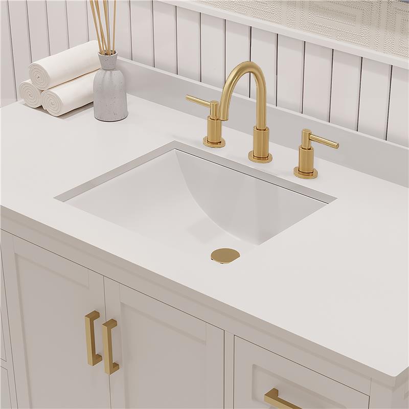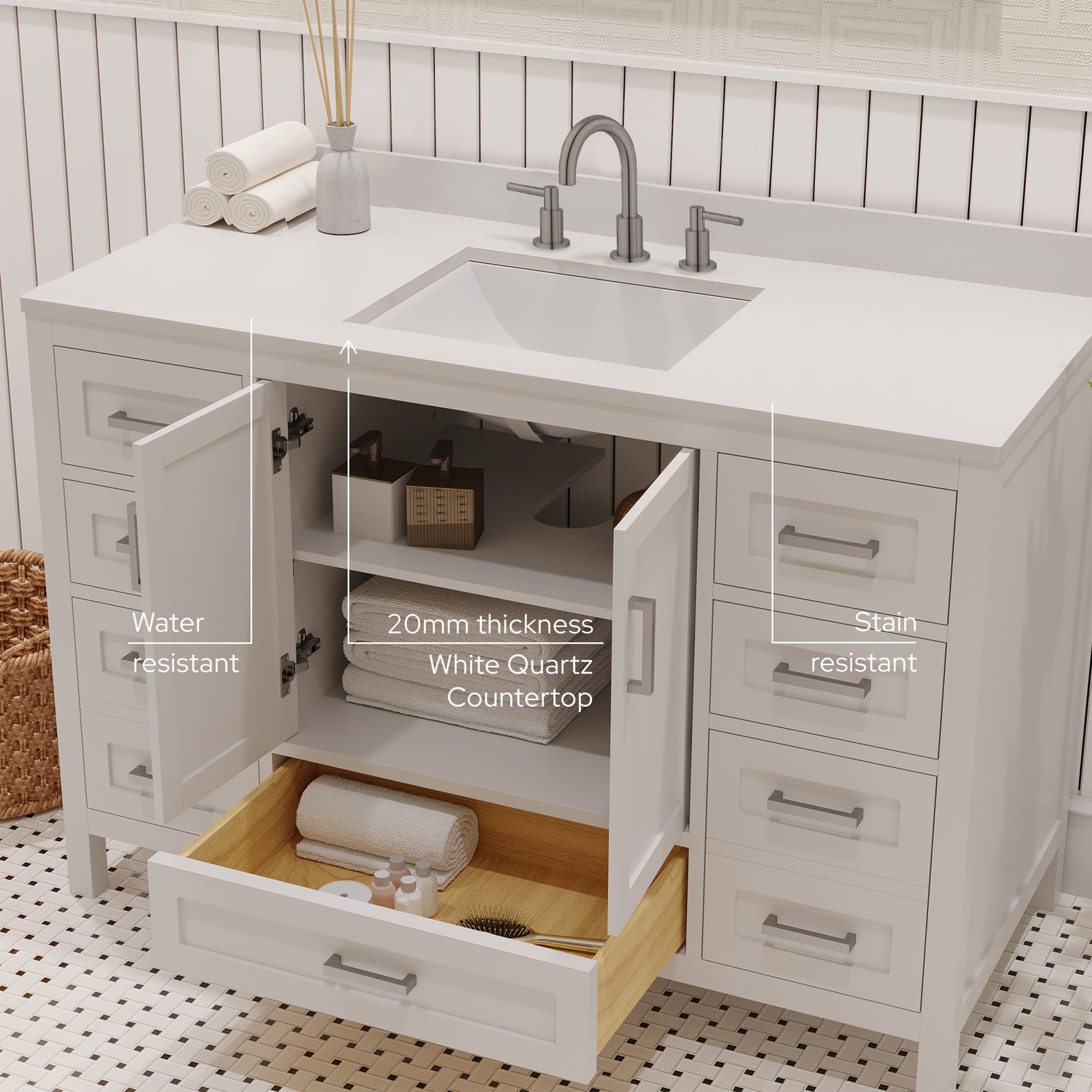 Countertop & Sink: Topped with a stain resistant quartz countertop features a single rectangular modern ceramic sink that adds style and functionality to your bathroom and making it simple to maintain. For that high end look and feel, white quartz provides a luxurious non-porous, surface that resistant to moisture, stains and fog. The countertop is complete with a matching, cohesive backsplash that protects your walls from water damage. Unlike MDF or particleboard vanities, our products are produced with 100% recyclable eco certified materials. This not only makes it a greener choice, but also a lifelong investment that will beautify your space for years to come.
