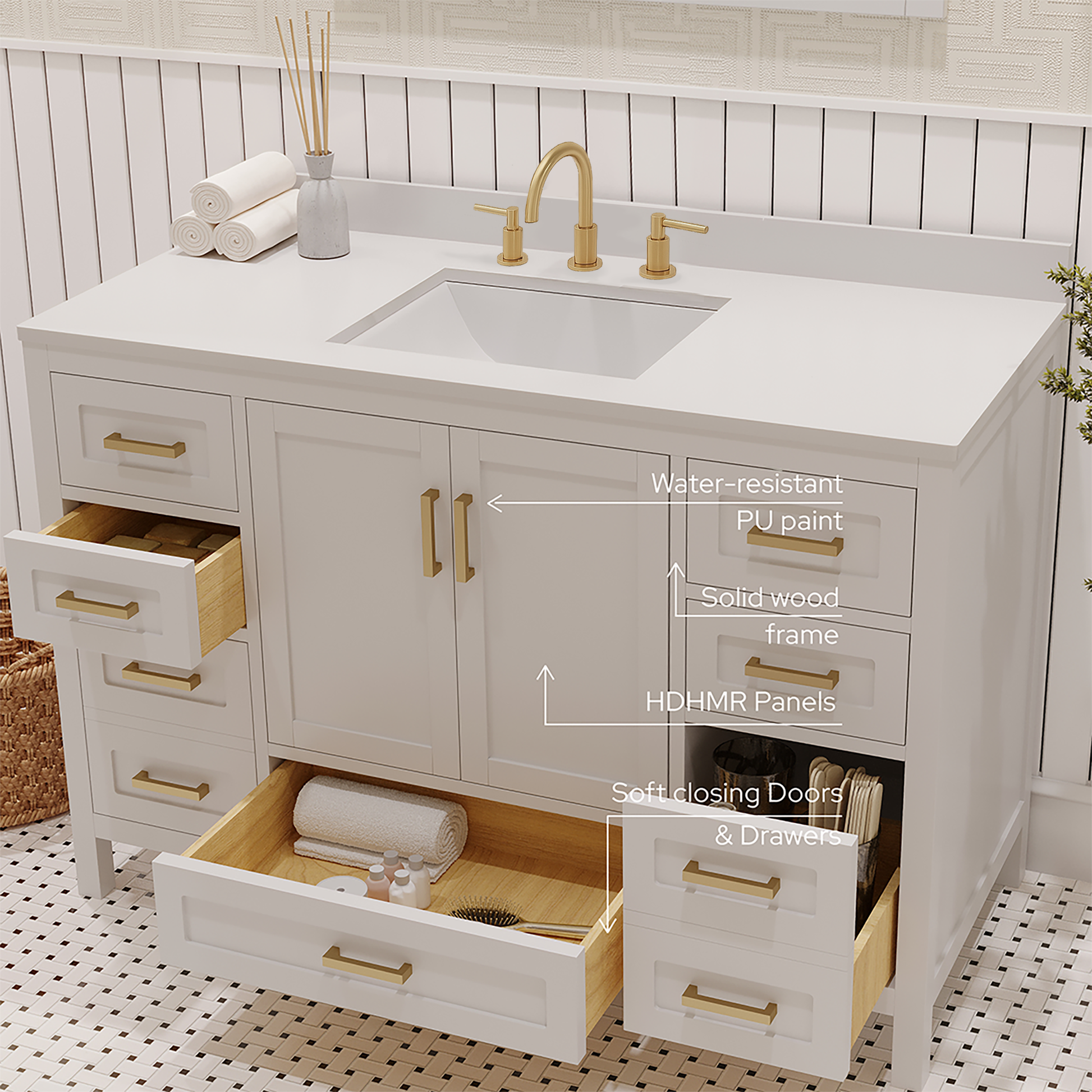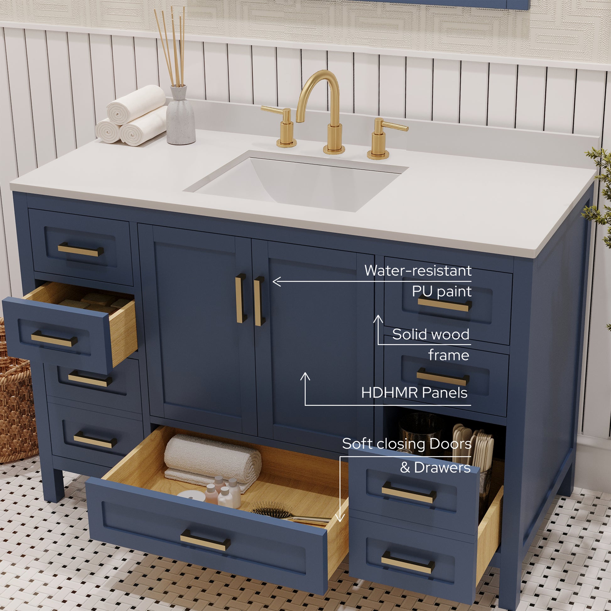 - Vanity is expertly made from solid pinewood and HDHMR board with solid brass hardware