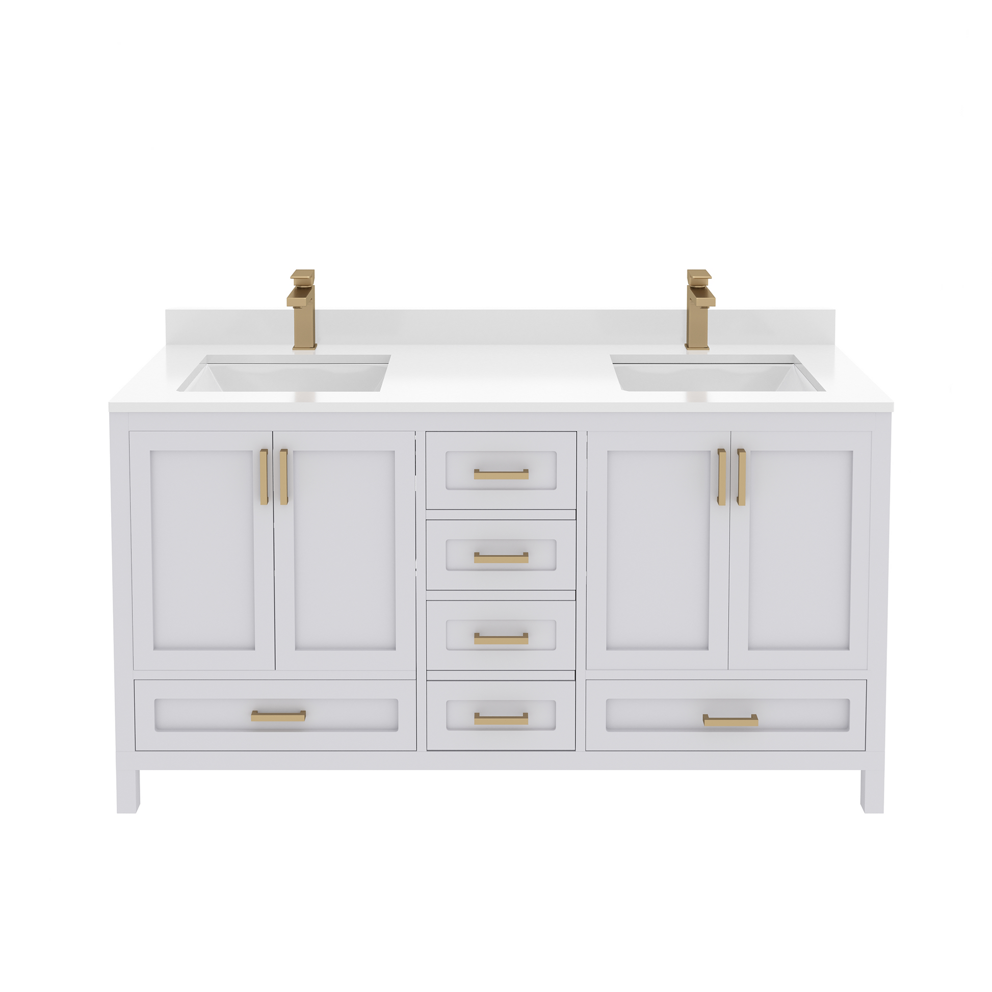 Countertop & Sink: Topped with a stain resistant quartz countertop features double rectangular modern ceramic sink that adds style and functionality to your bathroom and making it simple to maintain. For that high end look and feel, white quartz provides a luxurious non-porous, surface that resistant to moisture, stains and fog. The countertop is complete with a matching, cohesive backsplash that protects your walls from water damage. Unlike MDF or particleboard vanities, our products are produced with 100% recyclable eco certified materials. This not only makes it a greener choice, but also a lifelong investment that will beautify your space for years to come.
